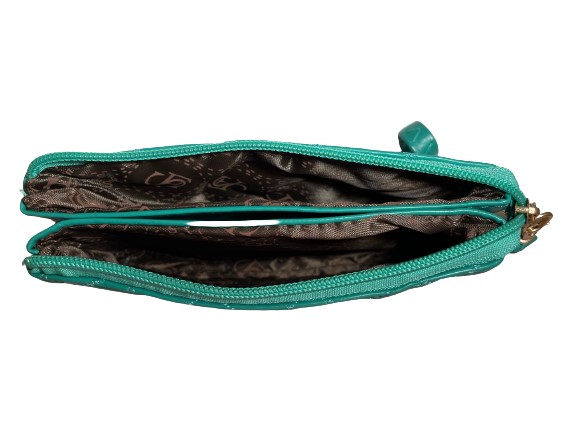 Γυναικείο πορτοφόλι πράσινο χρώμα με καπιτονέ υφή κατασκευασμένο από PU τεχνόδερμα, φοδραρισμένο εσωτερικά, μοντέρνο και ευρύχωρο καθότι χωράει και ταυτότητα καθώς και αλλά μικροαντικείμενα. Το πορτοφόλι ανοίγει με φερμουάρ και διαθέτει 3 εσωτερικές θήκες επίσης διαθέτει αποσπώμενο λουράκι.Διαστάσεις Μήκος 17cm,Yψος 10cm, Πλάτος 3cm.