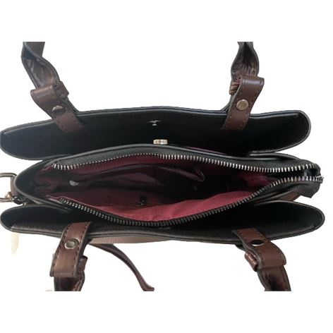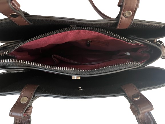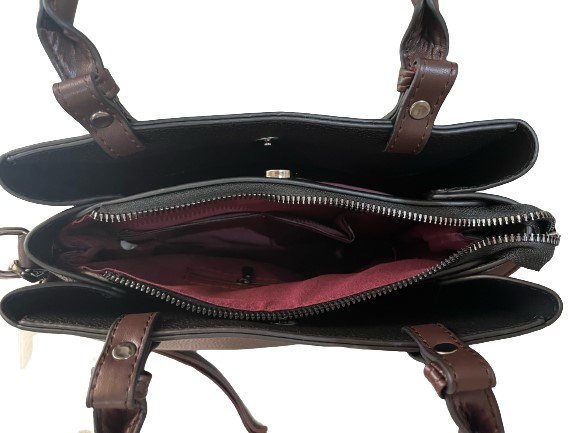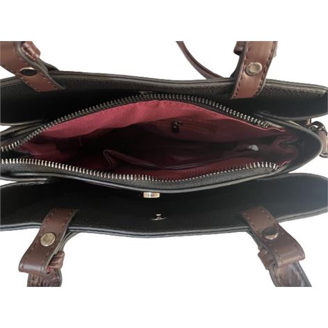 Η τσάντα διαθέτει 2 θήκες αριστερά- δεξιά που κλείνουν με ισχυρό μαγνητικό κούμπωμα και 1 κεντρική θήκη με που κλείνει με φερμουάρ η οποία εσωτερικά έχει 1 θήκη με φερμουάρ δεξιά και 2 υφασμάτινες θήκες για μικροαντικείμενα αριστερά, διαθέτει  χερούλια για κράτημα στο χέρι και αφαιρούμενο ρυθμιζόμενο ιμάντα για κράτημα στον ώμο ή χιαστί.