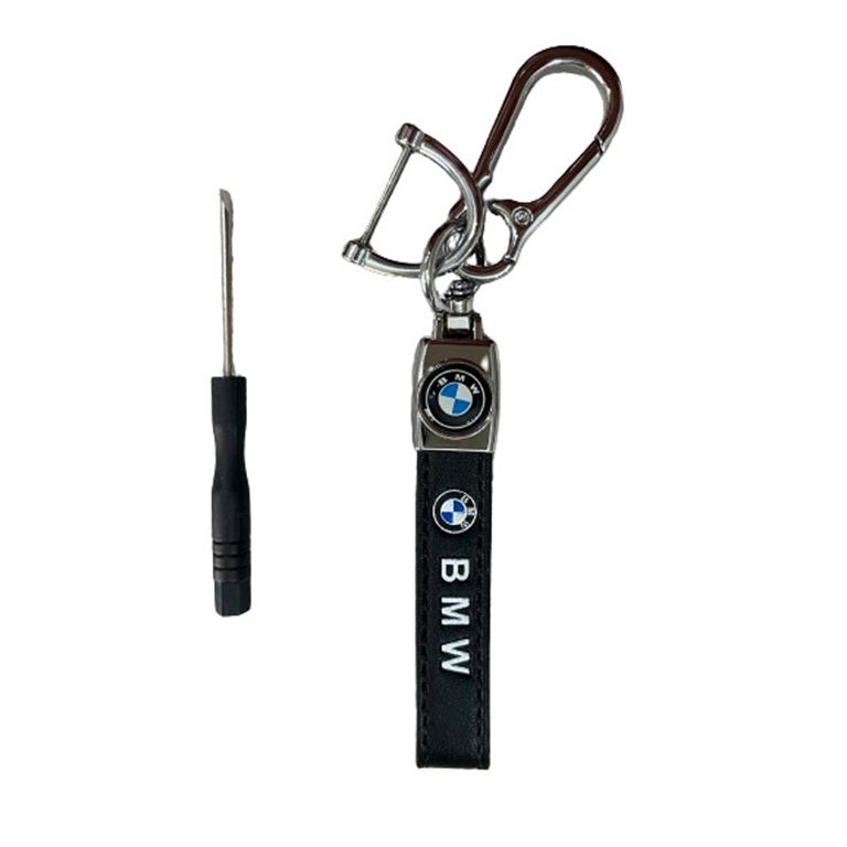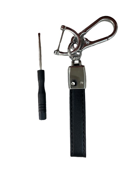 Μπρελόκ αυτοκινήτου από αναγεννημένο δέρμα PU και ατσάλι με κούμπωμα ασφαλείας και περιστροφή 360 μοίρες ανθεκτικό στις γρατζουνιές και περιμετρικά δεμένο με γαζί. Διαθέτει κρίκο για κλειδιά και extra κούμπωμα ασφαλείας με βίδα. Στην συσκευασία περιλαμβάνεται και το κατσαβίδι του. Διαστάσεις: Μήκος 8,5cm - Πλάτος 1,5cm.