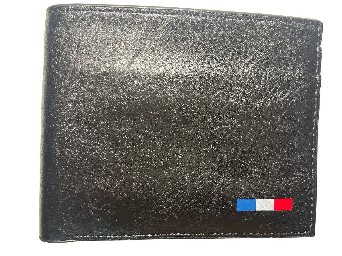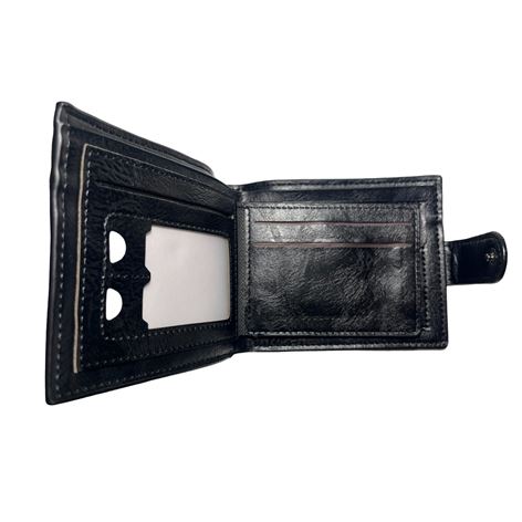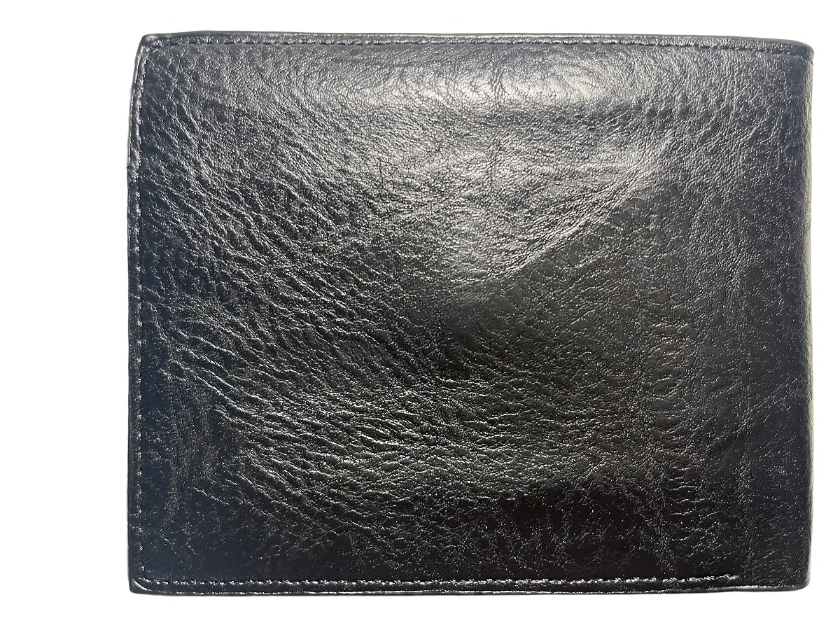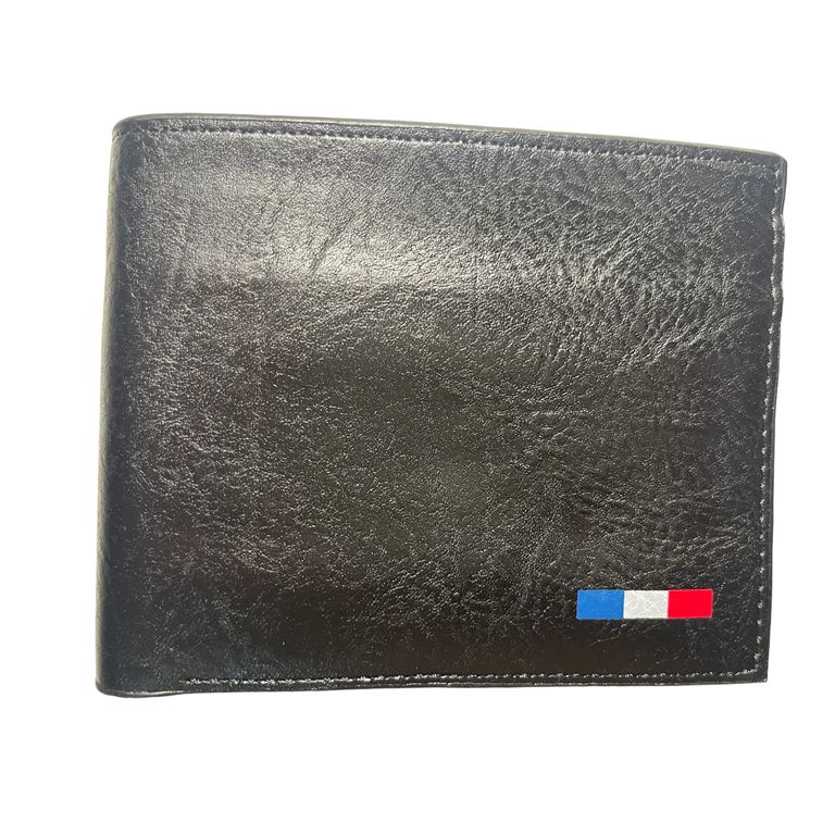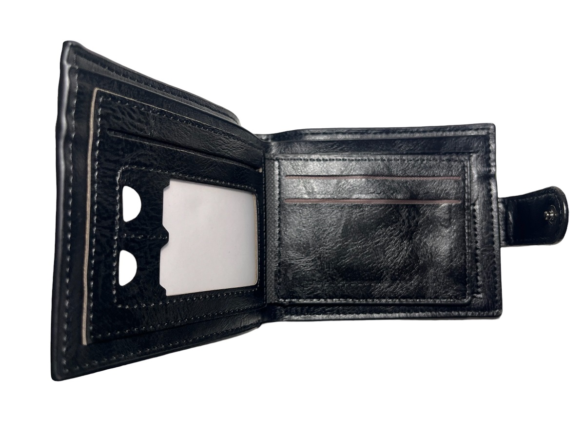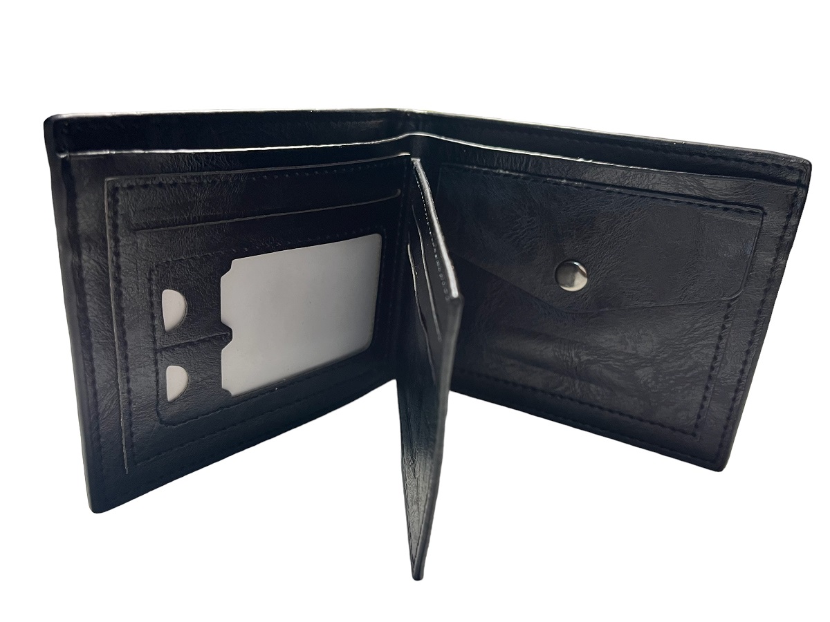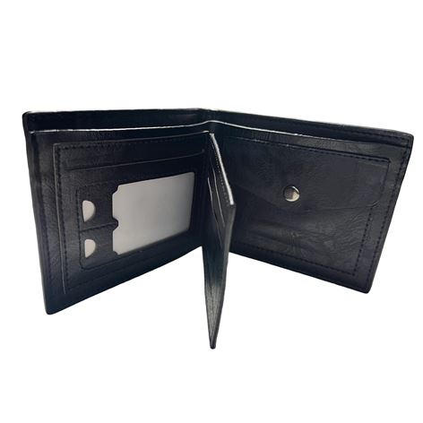 Ανδρικό πορτοφόλι υλικό PU τεχνόδερμα με ελαφρός σαγρέ υφή. Το πορτοφόλι διαθέτει 3 θήκες για κάρτες-δίπλωμα ένα παράθυρο για φωτογραφία, 1 θήκη για κέρματα, 3 θήκες για χαρτονομίσματα εκ των οποίων η μεσαία με φερμουάρ.