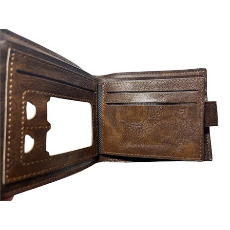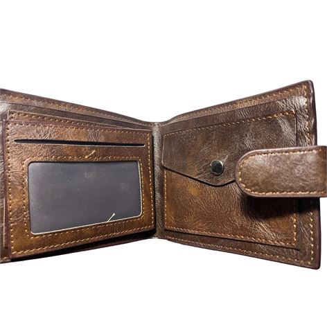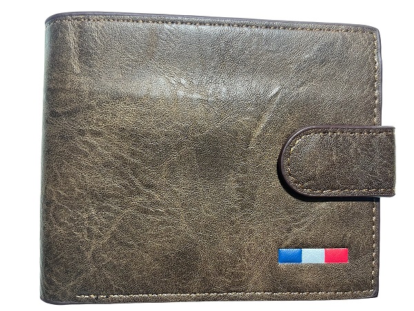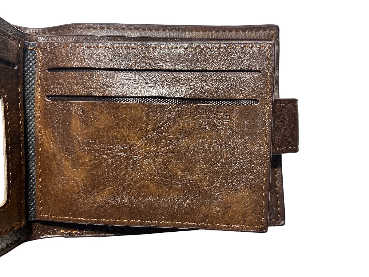 Ανδρικό πορτοφόλι υλικό PU τεχνόδερμα με ελαφρός σαγρέ υφή. Το πορτοφόλι διαθέτει 3 θήκες για κάρτες-δίπλωμα ένα παράθυρο για φωτογραφία, 1 θήκη για κέρματα, 3 θήκες για χαρτονομίσματα εκ των οποίων η μεσαία με φερμουάρ.