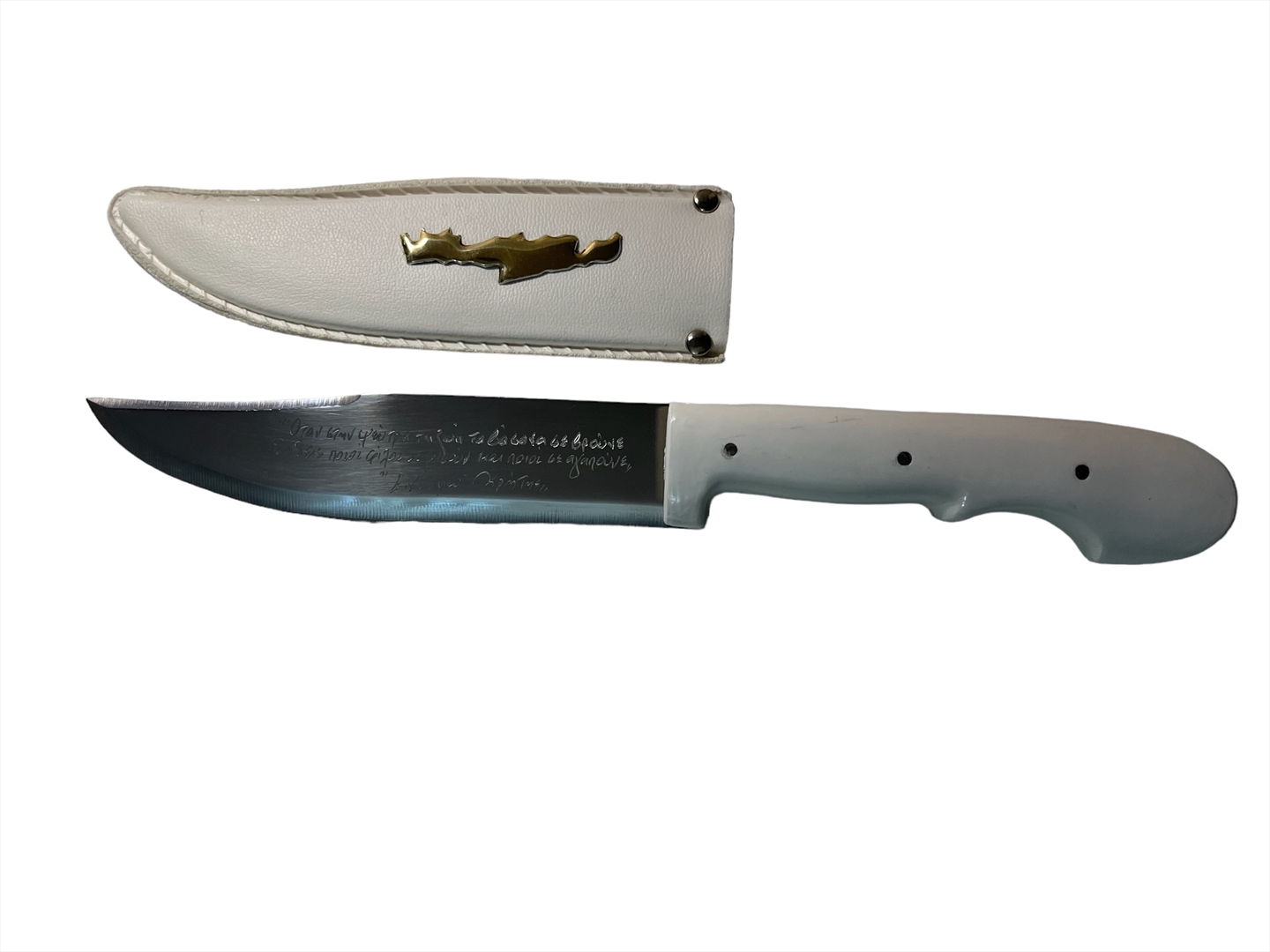 Μαχαίρι Κρητικό χειροποίητο κατασκευασμένο από ανωτάτης ποιότητος μέταλλο ατσάλι με λευκή λαβή, ενισχυμένο εσωτερικά με στήριγμα. Η λάμα του μαχαιριού είναι μονοκόμματη μέχρι πίσω στη λαβή για αντοχή σε βάθος χρόνου.