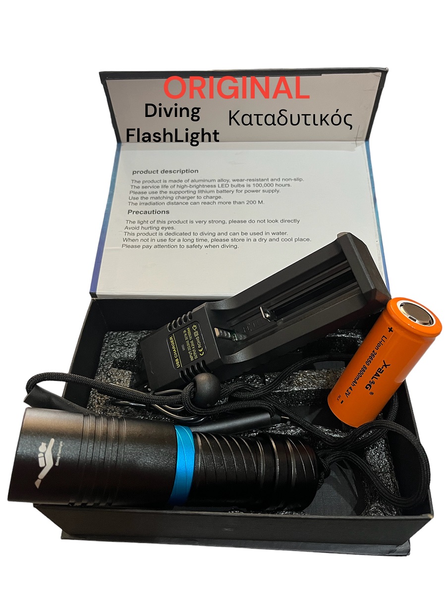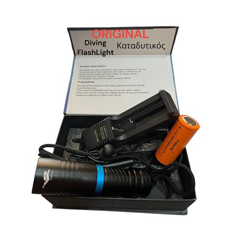 Φακός Led cree επαναφορτιζόμενος καταδυτικός με ψυχρό λευκό φωτισμό, διάρκεια λαμπτήρα 100.000 ώρες, 800 Lumen, με μία μπαταρία τύπου 26650 και στεγανότητα ΙPx8 πιστοποιημένος CE. Κατασκευασμένος από υλικά υψηλής ποιότητάς αλουμινίου σταθερής απόδοσης και αυτονομία λειτουργείας. Ο φακός είναι κατάλληλος για κατάδυση, κάμπινγκ, δραστηριότητες στο βουνό κλπ.
