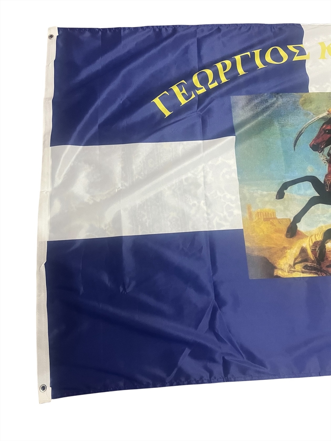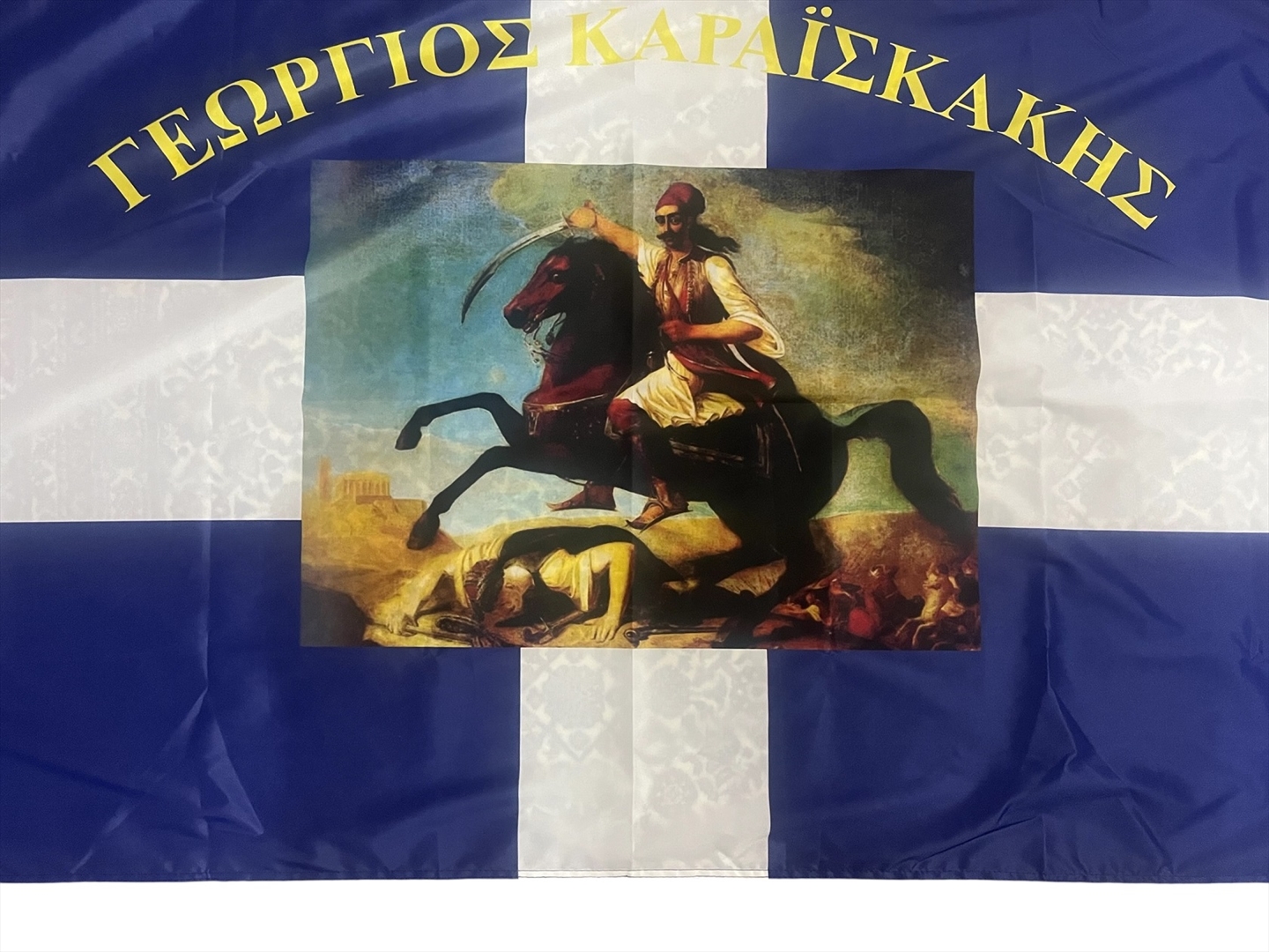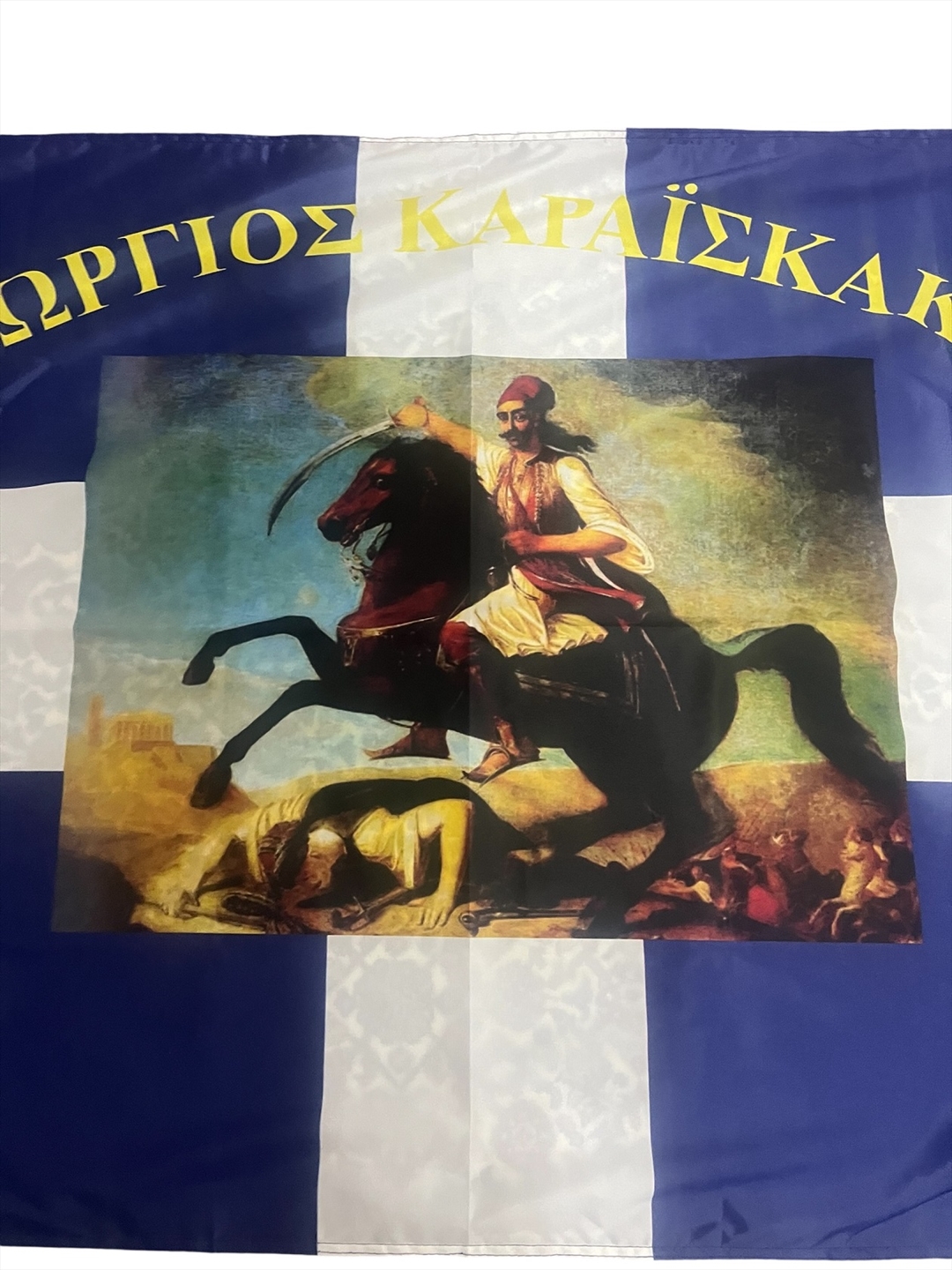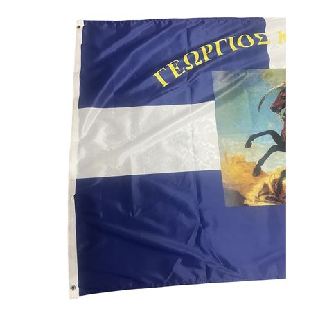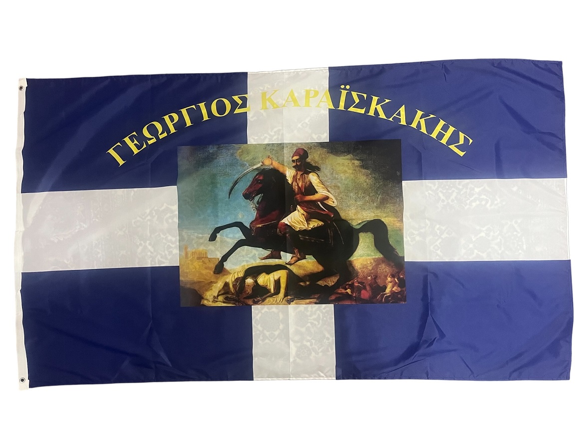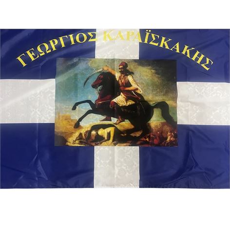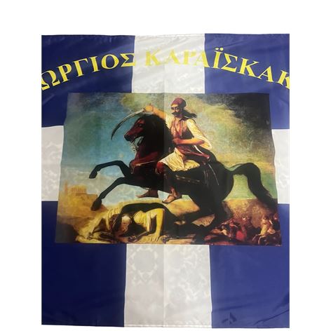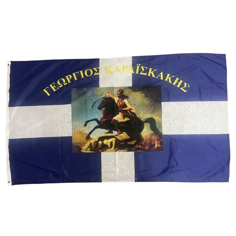 Ιστορική σημαία του Γεώργιου Καραισκάκη, αρίστης ποιότητος με σημαιόπανο τριπλής πλέξης 120gr , διπλές ραφές με υψηλής αντοχής κλωστές, οικολογικά ανεξίτηλα χρώματα με ανοξείδωτα τρουκς και με τελείωμα σε ειδικό φούρνο ατμίσματος ώστε να είναι αμετάβλητη στο χρόνο. Αντιανεμικό πολυεστερικό υλικό με αντοχή 120km φορτίο ανέμου.