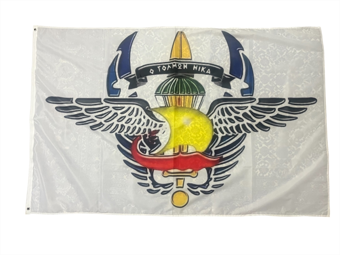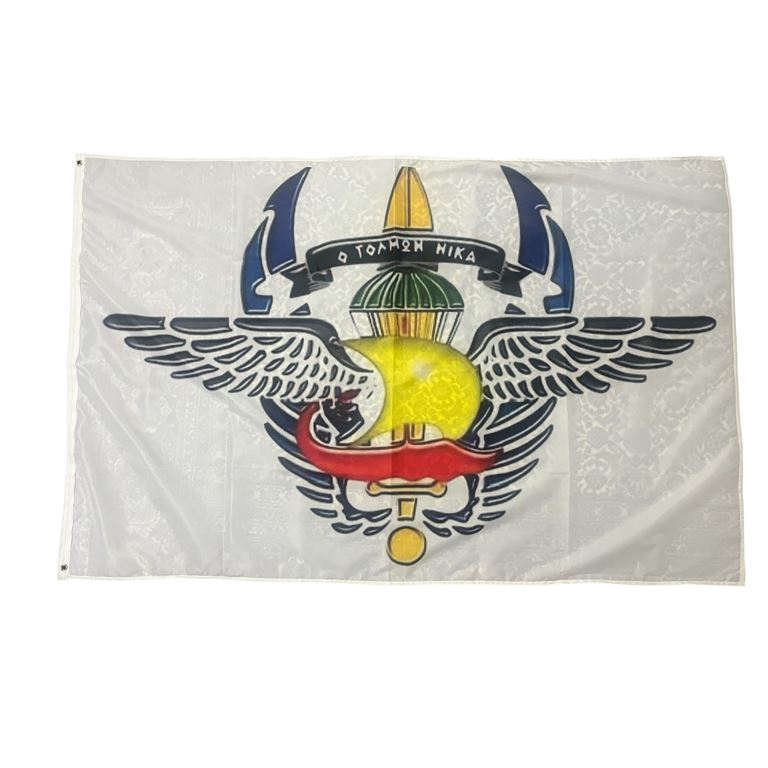 Σημαία ειδικών δυνάμεων αρίστης ποιότητος με σημαιόπανο τριπλής πλέξης 120gr , διπλές ραφές με υψηλής αντοχής κλωστές, οικολογικά ανεξίτηλα χρώματα με ανοξείδωτα τρουκς ή πλαστικούς κρίκους για ύψωση σε ιστό και με τελείωμα σε ειδικό φούρνο ατμίσματος ώστε να είναι αμετάβλητη στο χρόνο. Αντιανεμικό πολυεστερικό υλικό με αντοχή 120km φορτίο ανέμου.