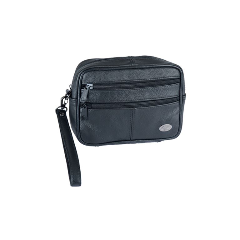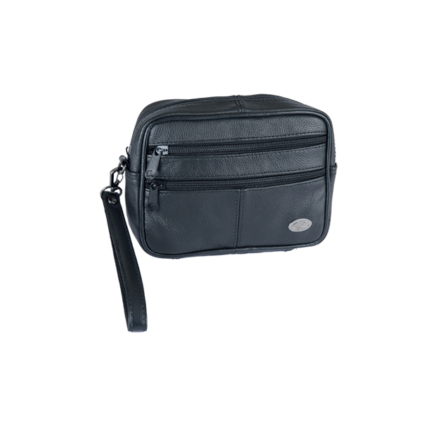 Δερμάτινο τσαντάκι χειρός( cow leather) χρώματος μαύρο με χερούλι, πολύ καλής ποιότητας εξαιρετικής αντοχής με απαλή υφή, φοδραρισμένο εσωτερικά, διαθέτει υποδοχή για να μπαίνει προαιρετικά και στην ζώνη. Διαστάσεις M x Y x Π (cm) 18 x 13 x 5,5 Το τσαντάκι διαθέτει 1 κεντρική θήκη με φερμουάρ, 2 θήκες με φερμουάρ μπροστά, 1 θήκη με φερμουάρ στο πίσω μέρος.