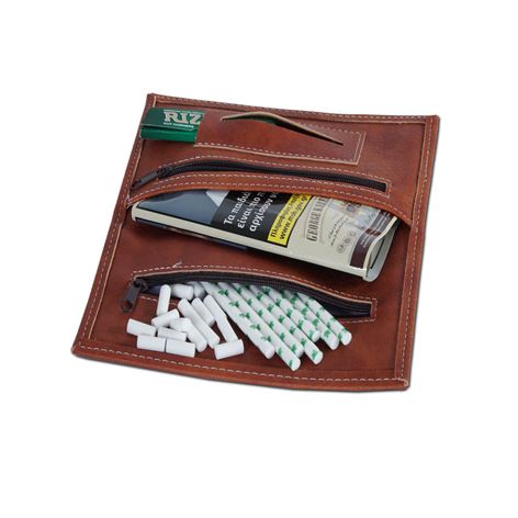 Καπνοθήκη μοντέρνα αρίστης ποιότητος τεχνόδερμα με εσωτερική επένδυση σιλικόνης για να διατηρείται ο καπνός φρέσκος χρώματος καφέ με γαζί περιμετρικά που χωράει το φακελάκι με τον καπνό και έχει θέση για χαρτάκια και φιλτράκια,με τέλεια εφαρμογή κλείνει με μαγνήτες και μία θήκη με φερμούαρ στο πίσω μέρος .Διαστάσεις M x Y x Π (cm) 16,5 x 8,5 x 1.