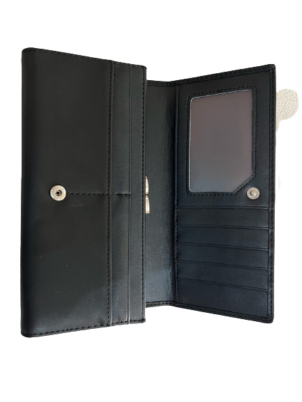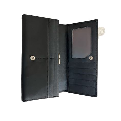 Μοντέρνο μαύρο γυναικείο πορτοφόλι , υλικό PU (Τεχνόδερμα), διαστάσεις μήκος (cm) 18,5 ύψος 9 πλάτος 2,5,Το πορτοφόλι διαθέτει , 1 θήκη για κέρματα, 9 θήκες για κάρτες, 3 θήκες για χαρτονομίσματα,1 εσωτερική θήκη με φερμουάρ.