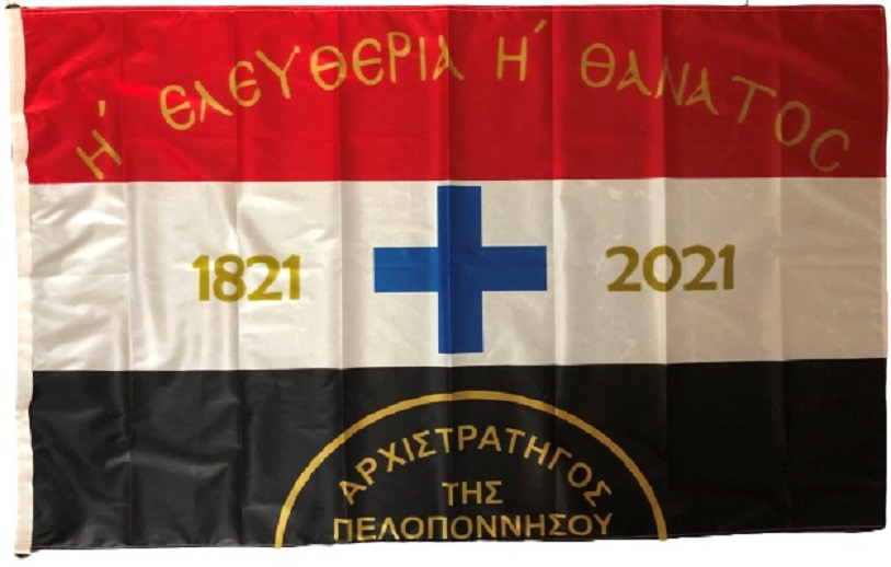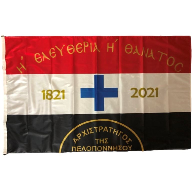 Ιστορική σημαία του Κολοκοτρώνη, αρίστης ποιότητος με σημαιόπανο τριπλής πλέξης 120gr , διπλές ραφές με υψηλής αντοχής κλωστές, οικολογικά ανεξίτηλα χρώματα με ανοξείδωτα τρουκς και με τελείωμα σε ειδικό φούρνο ατμίσματος ώστε να είναι αμετάβλητη στο χρόνο. Αντιανεμικό πολυεστερικό υλικό με αντοχή 120km φορτίο ανέμου.