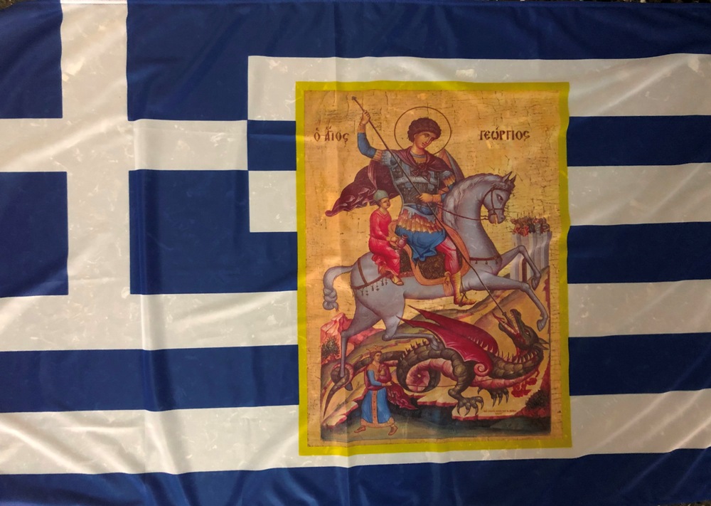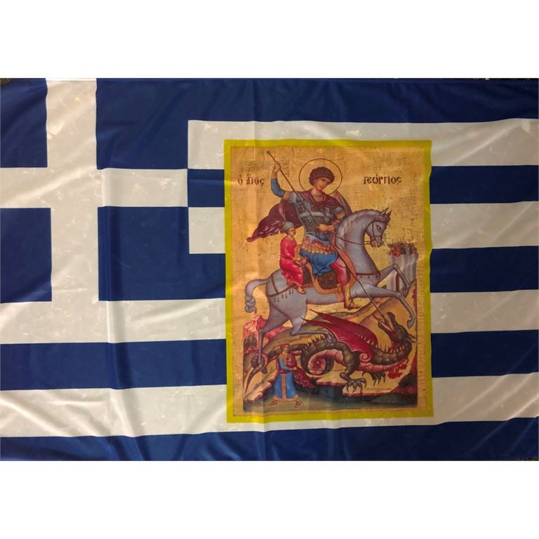 Ιστορική Ελληνική σημαία με τον Άγιο Γεώργιο , αρίστης ποιότητος με σημαιόπανο τριπλής πλέξης 120gr , διπλές ραφές με υψηλής αντοχής κλωστές, οικολογικά ανεξίτηλα χρώματα με ανοξείδωτα τρουκς και με τελείωμα σε ειδικό φούρνο ατμίσματος ώστε να είναι αμετάβλητη στο χρόνο. Αντιανεμικό πολυεστερικό υλικό με αντοχή 120km φορτίο ανέμου.