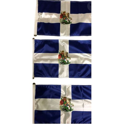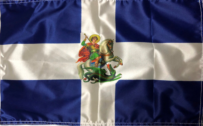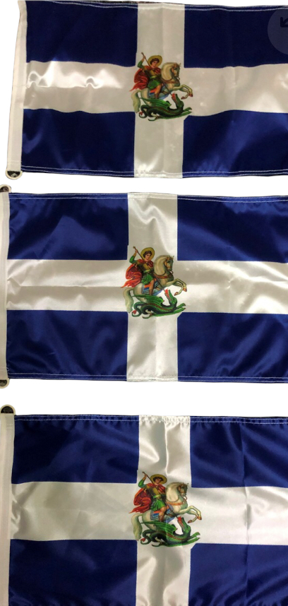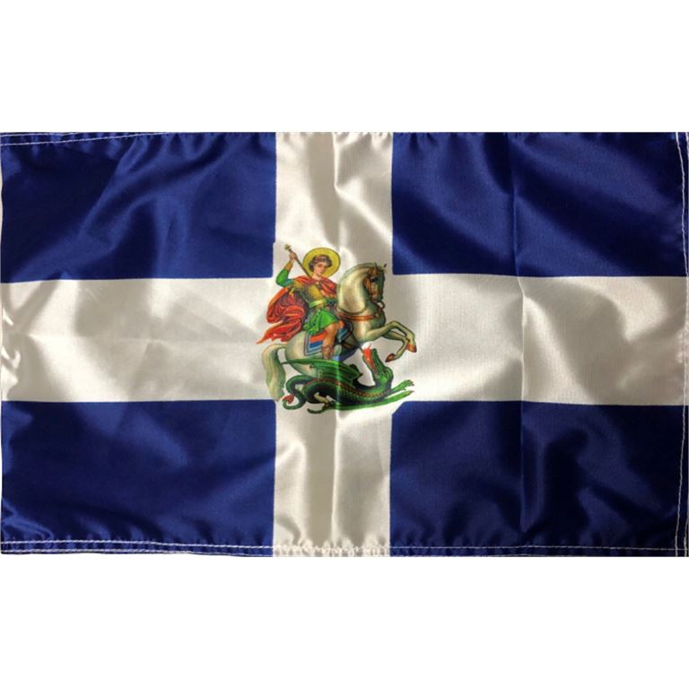 Ιστορική Ελληνική σημαία με τον Άγιο Γεώργιο, αρίστης ποιότητος με σημαιόπανο τριπλής πλέξης , διπλές ραφές με υψηλής αντοχής κλωστές, οικολογικά ανεξίτηλα χρώματα με ισχυρούς πλαστικούς κρίκους και με τελείωμα σε ειδικό φούρνο ατμίσματος ώστε να είναι αμετάβλητη στο χρόνο. Αντιανεμικό πολυεστερικό υλικό με αντοχή 120km φορτίο ανέμου.