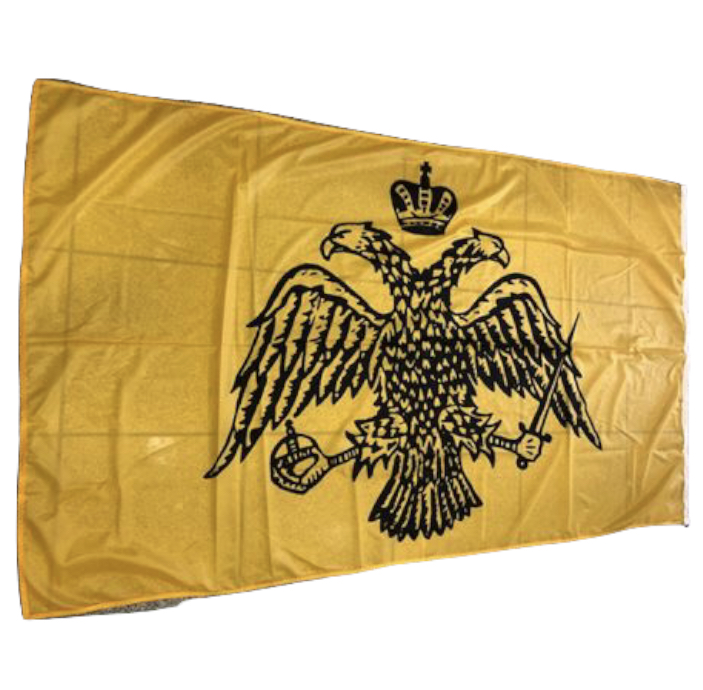 Σημαία Βυζαντίου με αρίστης ποιότητας υλικά με ενισχυμένο πολυεστερικό σημαιόπανο με 3 γαζιά, φοδραρισμένη, Ακρυλικές κλωστές και ατμισμένη για αντοχή στα καιρικά φαινόμενα και στα φορτία ανέμων. Διάσταση 2,50 μήκος x 1,50 πλάτος.