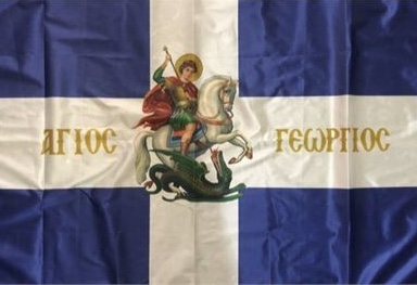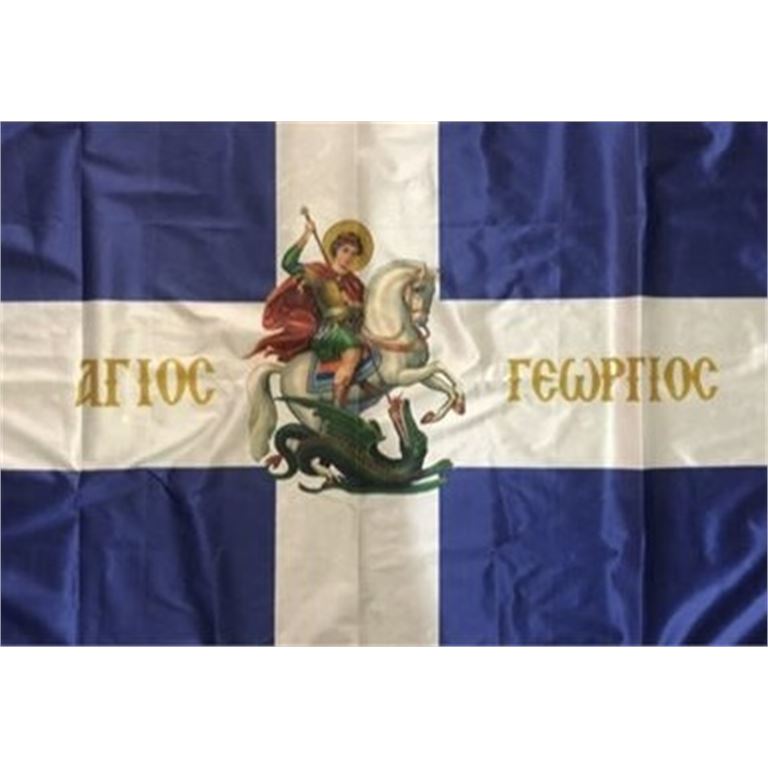 Ιστορική Ελληνική σημαία με τον Άγιο Γεώργιο, αρίστης ποιότητος με σημαιόπανο τριπλής πλέξης  , διπλές ραφές με υψηλής αντοχής κλωστές, οικολογικά ανεξίτηλα χρώματα με ισχυρούς πλαστικούς κρίκους και με τελείωμα σε ειδικό φούρνο ατμίσματος ώστε να είναι αμετάβλητη στο χρόνο. Αντιανεμικό πολυεστερικό υλικό με αντοχή 120km φορτίο ανέμου.