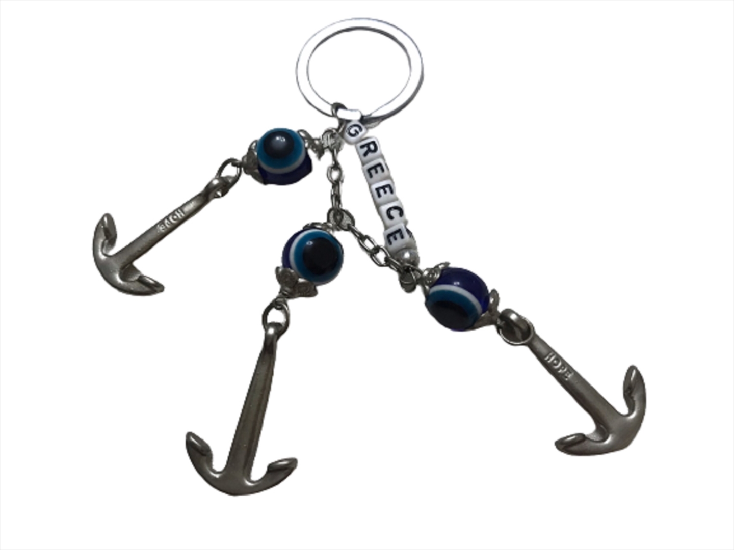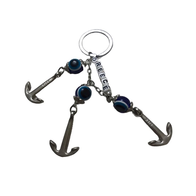 Μπρελόκ μεταλλικό με 3 άγκυρες και 3 ματόχαντρα καθώς και μικρά ζαράκια που γράφουν την λέξη GREECE.
