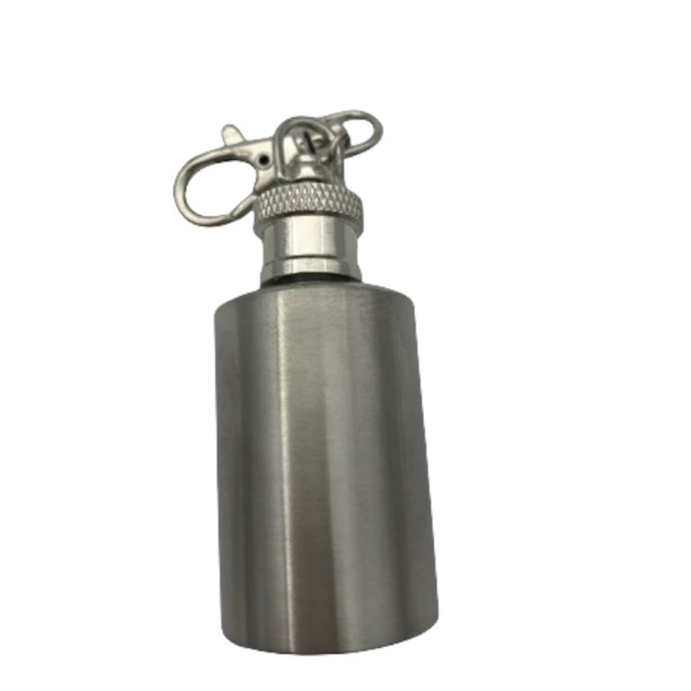 Mini φλασκί πολυτελείας 30ml από καθαρό ανοξείδωτο ατσάλι στρογγυλό σχέδιο κούμπωμα ασφαλέιας, έχει κρίκο μπορεί να φορεθεί ως μπρελόκ και περνάει απαρατήρητο.Χωρητικότητα 28,5gr.
