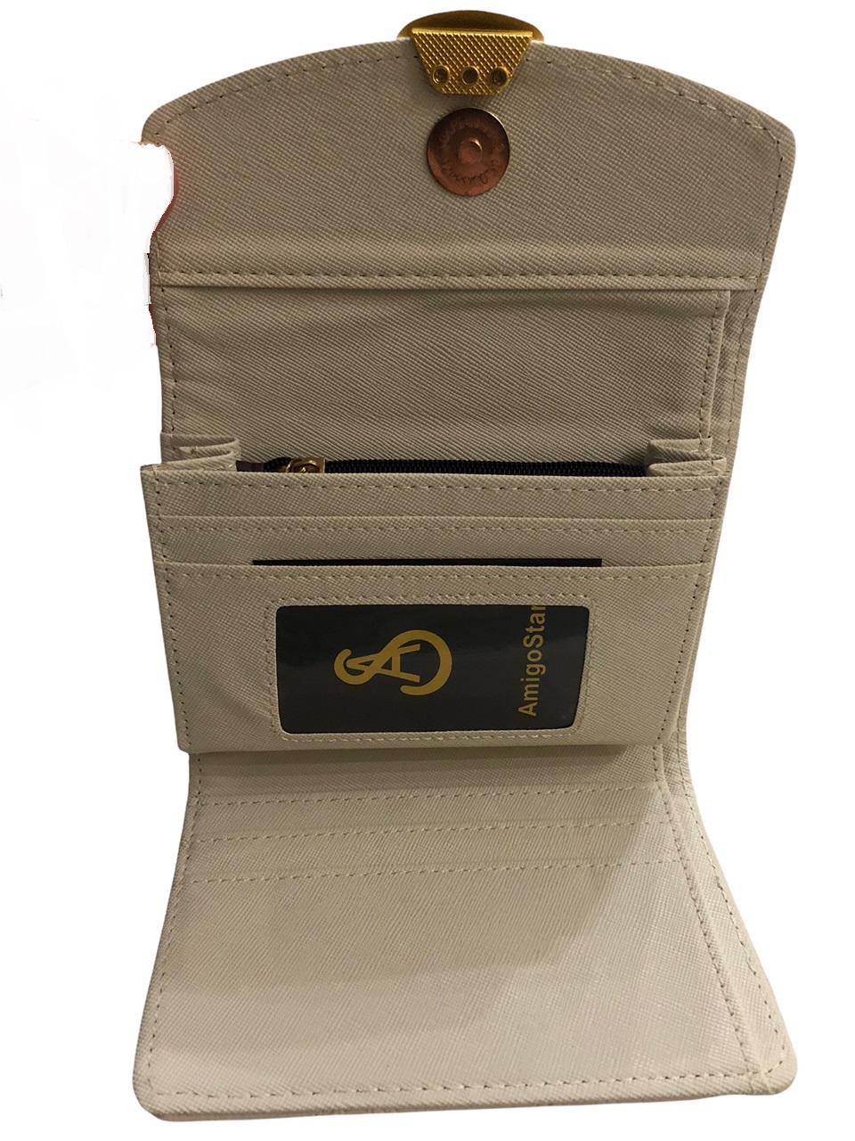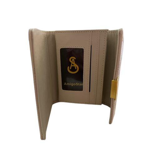 Το πορτοφόλι κλείνει με μαγνητικό κούμπωμα και φέρει μεταλλικό χρυσό διακοσμητικό στοιχείο στην μπροστινή όψη.
