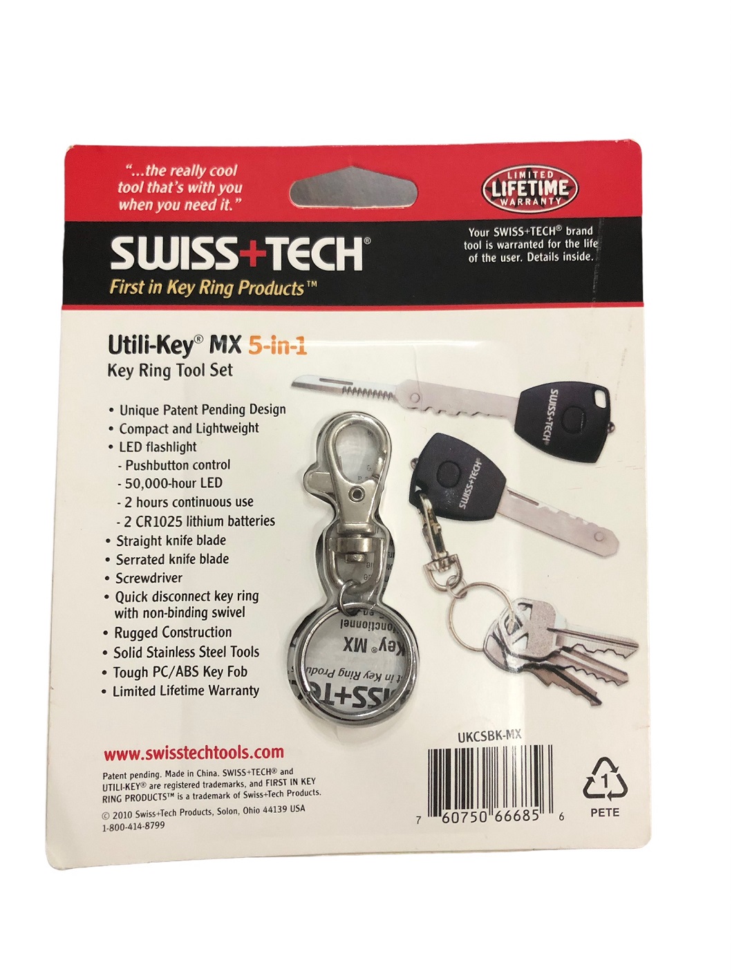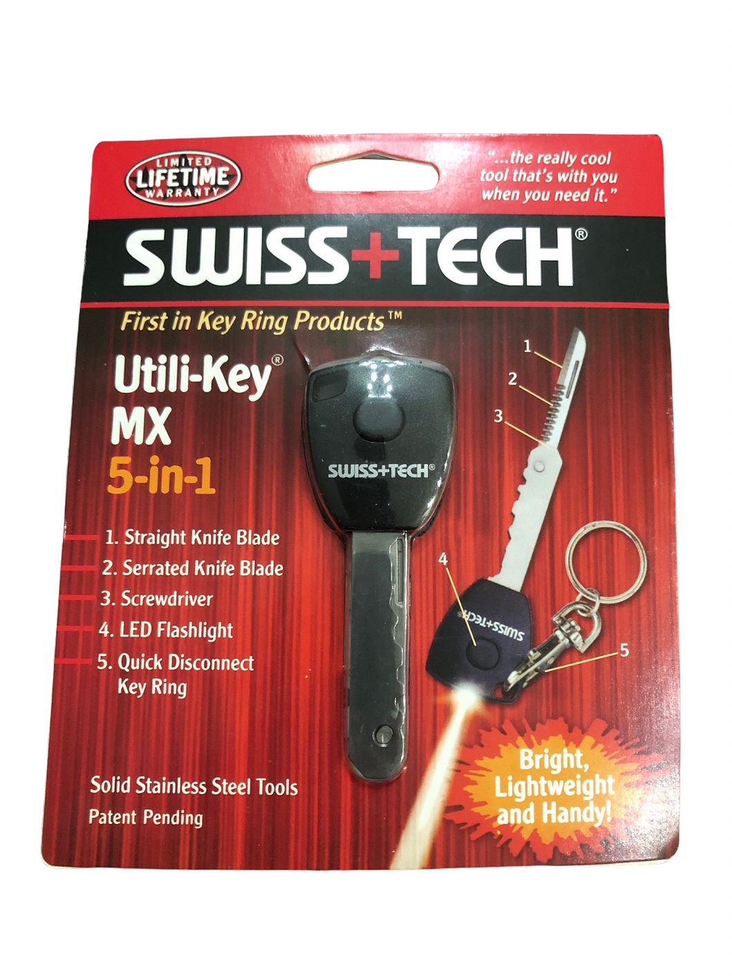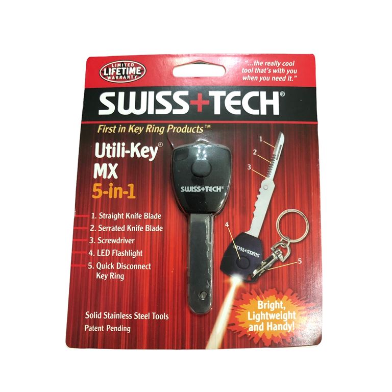 Διαθέτει ευθύ μαχαίρι, οδοντωτό μαχαίρι φακό LED (διάρκεια 50.000 ώρες), κατσαβίδι, κρίκο για κλειδιά ταχείας απελευθέρωσης συμπαγές και ανθεκτική κατασκευή από πλαστικό ABS.