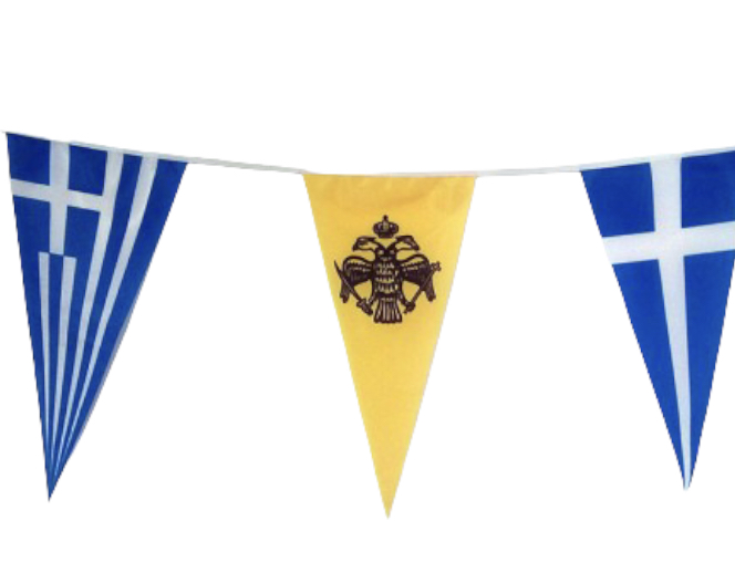 Γιρλάντα ελληνικά και βυζαντινά σημαιάκια μήκος 10m σύνολο 14 σημαιάκια μεγέθους 30x52cm το κάθε ένα .