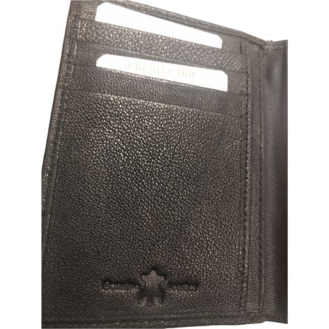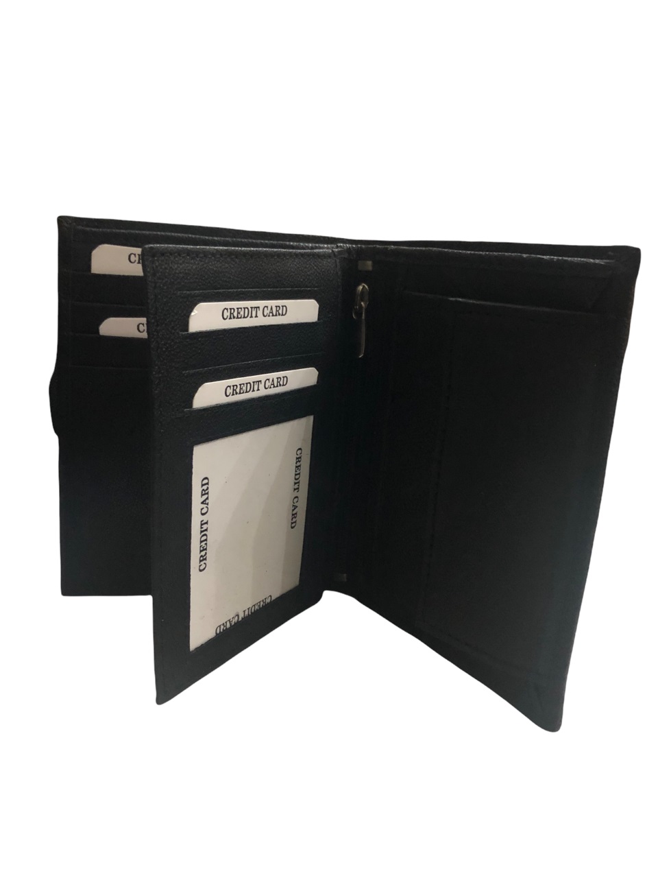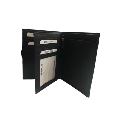 Δερμάτινο ανδρικό πορτοφόλι κάθετο με σφραγίδα γνησιότητας επάνω στο δέρμα εξαιρετικής ποιότητος με θήκη για ταυτότητα,2 θήκες βαθιές με χώρισμα αναμεσά τους για χαρτονομίσματα 8 θήκες για κάρτες, θήκη για κέρματα με μεταλλικό κούμπωμα 6 κρυφές εσωτερικές θήκες στο πλάι αριστερά-δεξιά, 2 επιπλέον εσωτερικές θήκες που ανοίγουν με φερμουάρ. Πολύ μαλακό δέρμα.