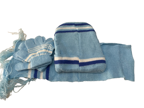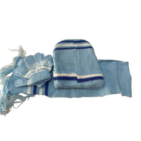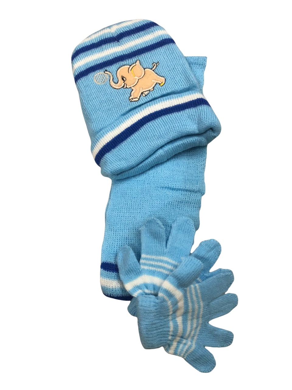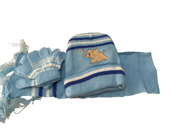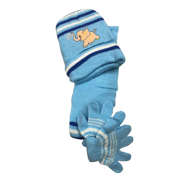Σετ παιδικό (Γάντια, κασκόλ,σκούφο) πλεκτό γαλάζιο χρώμα με σχέδιο ελεφαντάκι.
