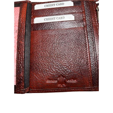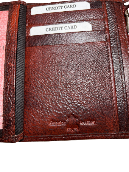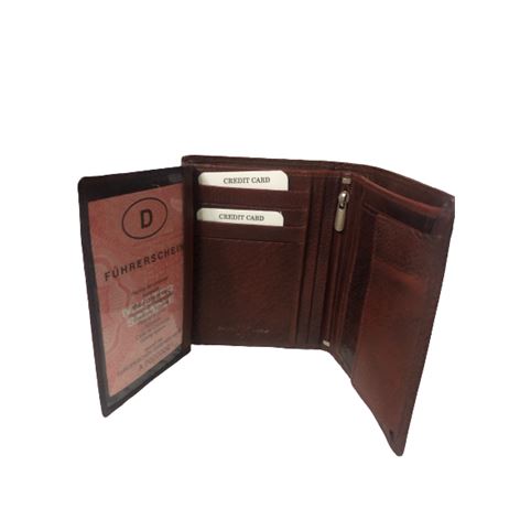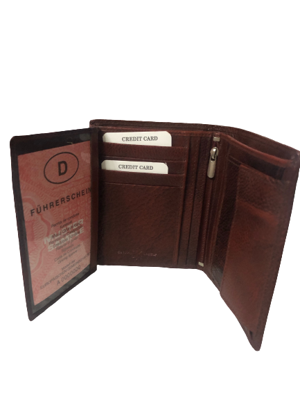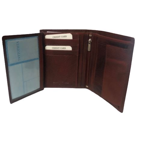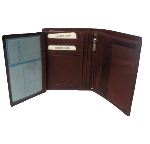 Δερμάτινο ανδρικό πορτοφόλι κάθετο με σφραγίδα γνησιότητας επάνω στο δέρμα εξαιρετικής ποιότητος με θήκη για ταυτότητα,2 θήκες βαθιές με χώρισμα αναμεσά τους για χαρτονομίσματα 8 θήκες για κάρτες, θήκη για κέρματα με μεταλλικό κούμπωμα 6 κρυφές εσωτερικές θήκες στο πλάι αριστερά-δεξιά, 2 επιπλέον εσωτερικές θήκες που ανοίγουν με φερμουάρ. Πολύ μαλακό δέρμα.