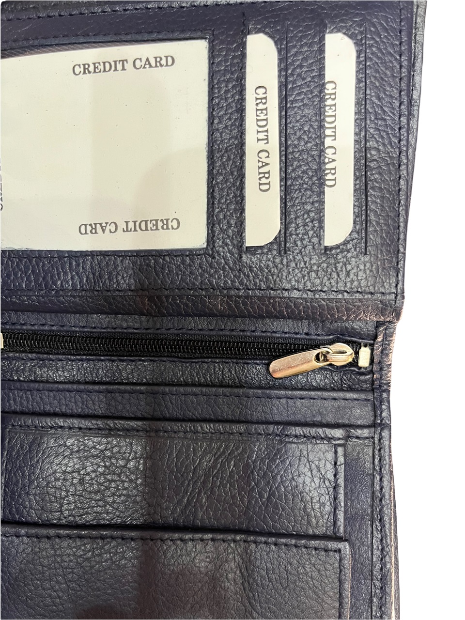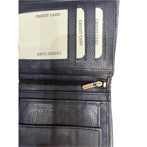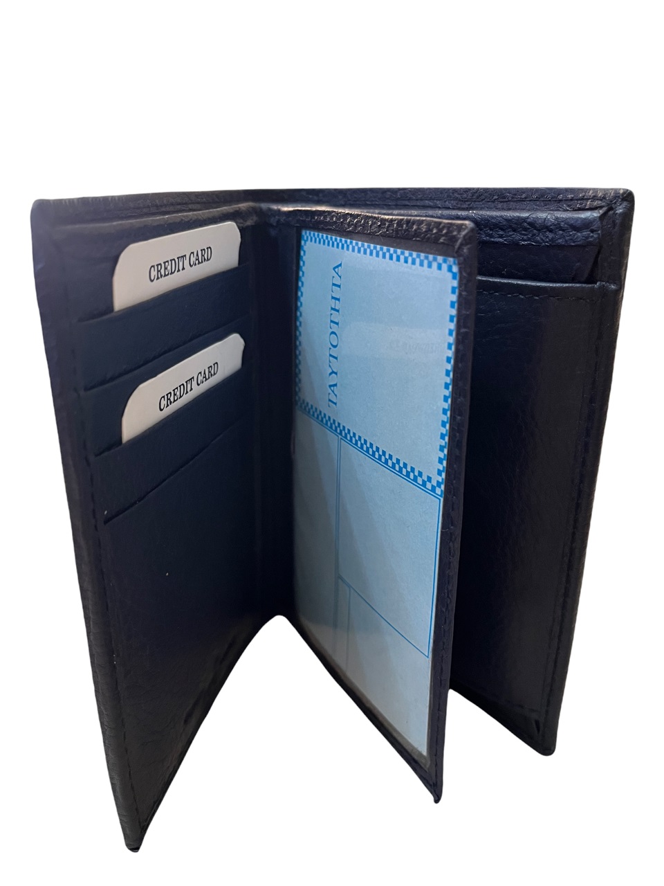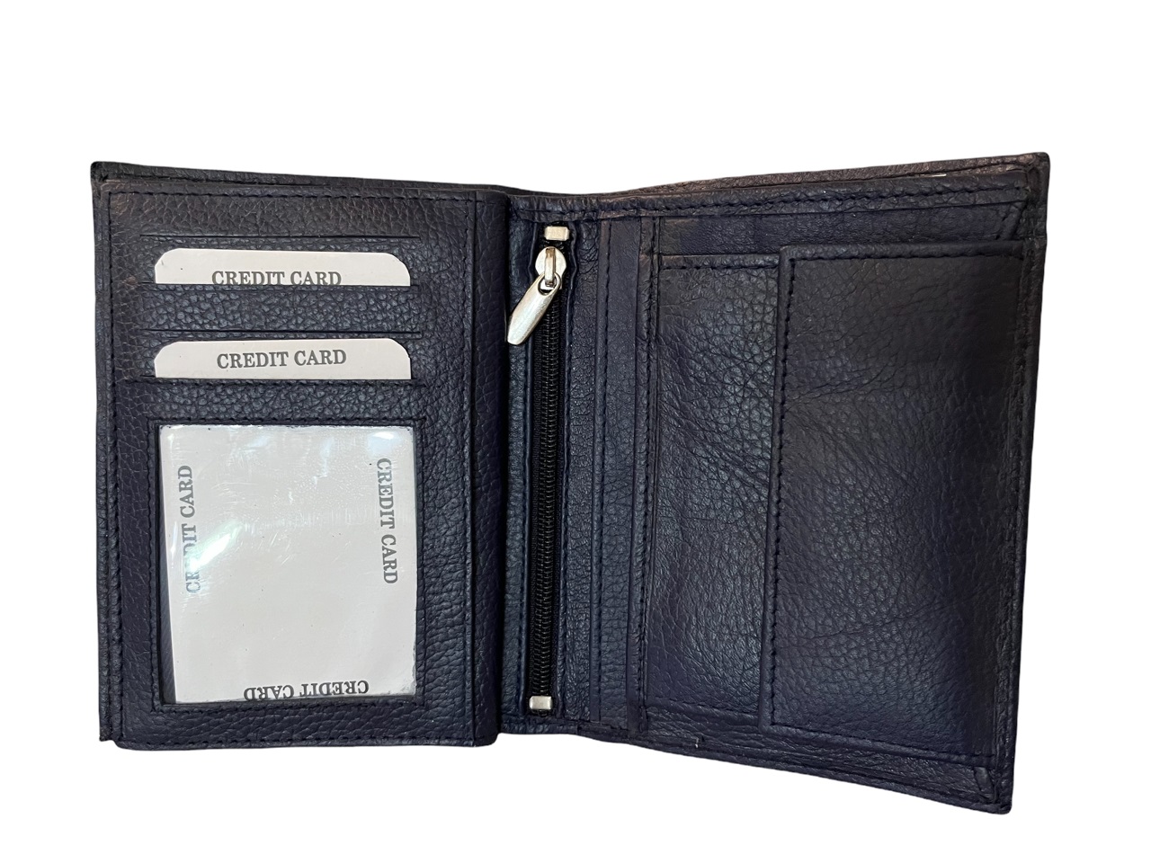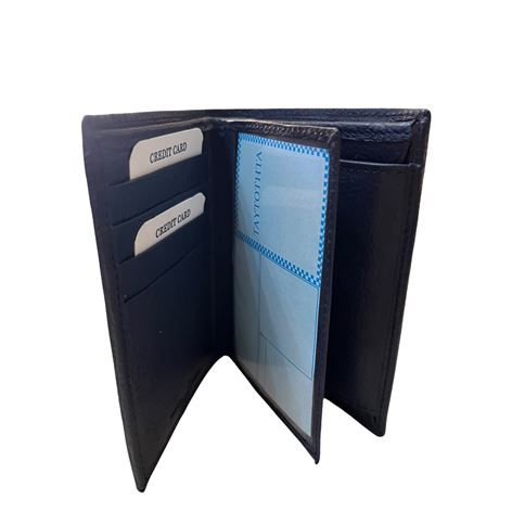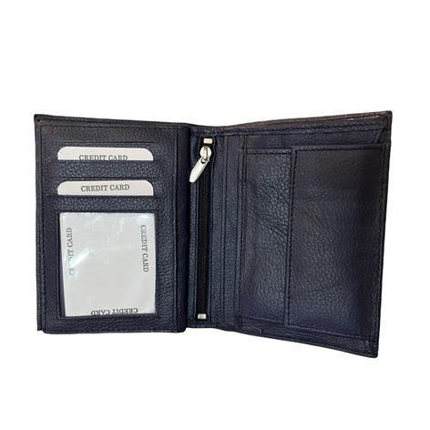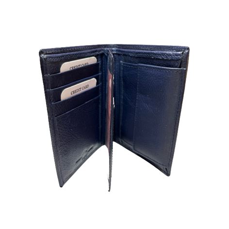 Δερμάτινο ανδρικό πορτοφόλι κάθετο με σφραγίδα γνησιότητας επάνω στο δέρμα εξαιρετικής ποιότητος με θήκη για ταυτότητα,2 θήκες βαθιές με χώρισμα αναμεσά τους για χαρτονομίσματα 8 θήκες για κάρτες, θήκη για κέρματα με μεταλλικό κούμπωμα 6 κρυφές εσωτερικές θήκες στο πλάι αριστερά-δεξιά, 2 επιπλέον εσωτερικές θήκες που ανοίγουν με φερμουάρ. Πολύ μαλακό δέρμα.