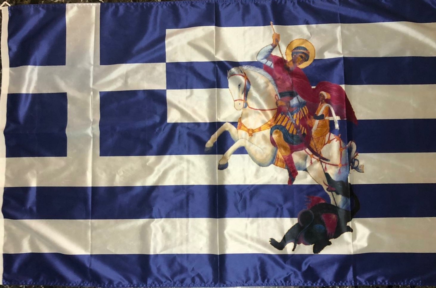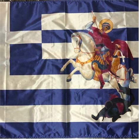 Ιστορική Ελληνική σημαία με τον Άγιο Γεώργιο, αρίστης ποιότητος με σημαιόπανο τριπλής πλέξης 120gr , διπλές ραφές με υψηλής αντοχής κλωστές, οικολογικά ανεξίτηλα χρώματα με ανοξείδωτα τρουκς και με τελείωμα σε ειδικό φούρνο ατμίσματος ώστε να είναι αμετάβλητη στο χρόνο. Αντιανεμικό πολυεστερικό υλικό με αντοχή 120km φορτίο ανέμου.