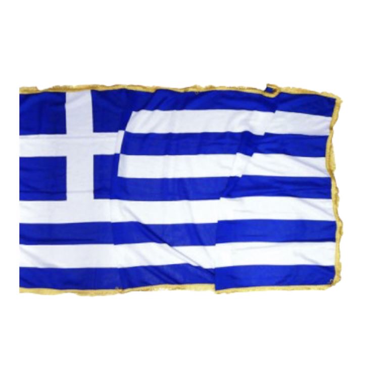 Ελληνική σημαία εξολοκλήρου από καραβίσιο Σημαιόπανο, Αντιανεμική, περιμετρικά γαζωμένη με χρυσό κρόσσι, οικολογικά χρώματα αμετάβλητα και ανθεκτικά στον χρόνο, ατσαλάκωτη, ιδανική για τις εθνικές εορτές μας-σχολεία-παρελάσεις-εκδηλώσεις-στολισμό κτιρίων.