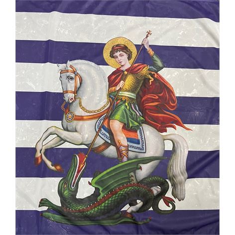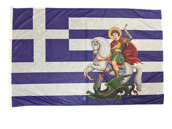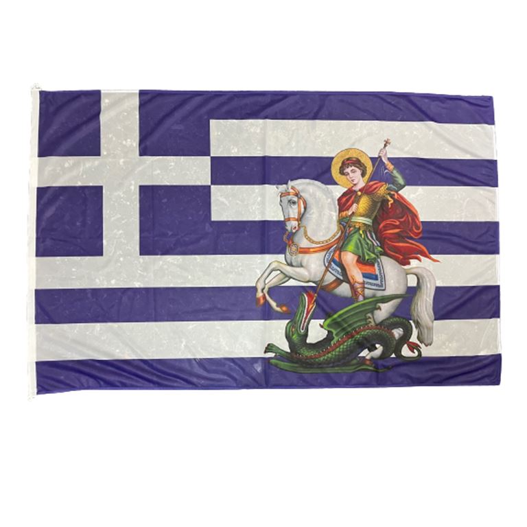 Ελληνική σημαία με τον Άγιο Γεώργιο, αρίστης ποιότητος με σημαιόπανο τριπλής πλέξης 120gr , διπλές ραφές με υψηλής αντοχής κλωστές, οικολογικά ανεξίτηλα χρώματα με ανοξείδωτα τρουκς και με τελείωμα σε ειδικό φούρνο ατμίσματος ώστε να είναι αμετάβλητη στο χρόνο. Αντιανεμικό πολυεστερικό υλικό με αντοχή 120km φορτίο ανέμου.