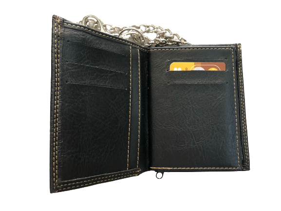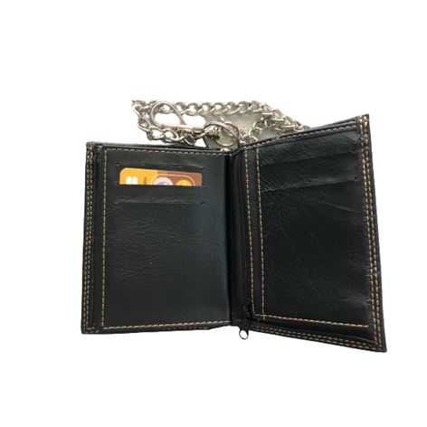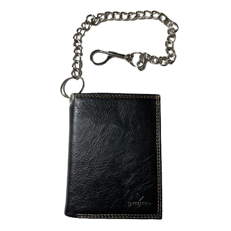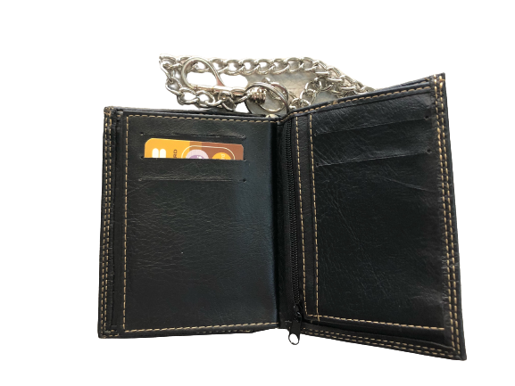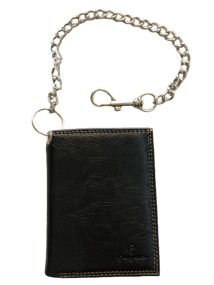 Πορτοφόλι ανδρικό από PU τεχνόδερμα μαζί με ατσάλινη αλυσίδα και κρίκο, φοδραρισμένο με γαζιά μέσα-έξω και εξωτερικές ραφές. Το πορτοφόλι διαθέτει 2 θήκες για χαρτονομίσματα εκ των οποίων ή 1 με φερμουάρ,2 θήκες για φωτογραφία, ,11 θήκες για πιστωτικές κάρτες,3 κρυφές θήκες στο πλάι αριστερά-δεξιά,1 θήκη με φερμουάρ για κέρματα και με την αλυσίδα και το κούμπωμα για το θυλάκι προφυλάσσεται από κακόβουλες πράξεις.