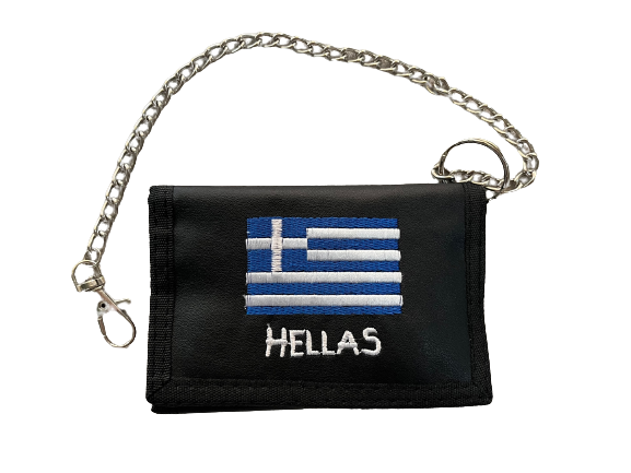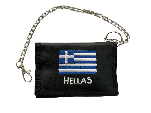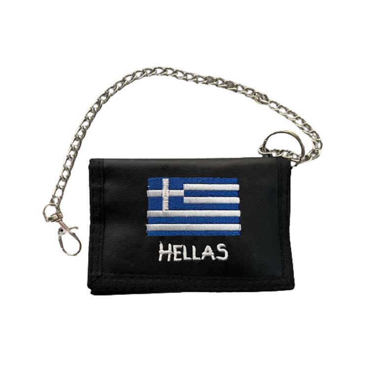 Πορτοφόλι με κέντημα την Ελληνική σημαία το πορτοφόλι διαθέτει 1 εσωτερική θήκη για χαρτονομίσματα, 4 εσωτερικές θήκες για δίπλωμα κάρτες κλπ,1 εσωτερική διάφανη θήκη για φωτογραφία και 1 θήκη για κέρματα.