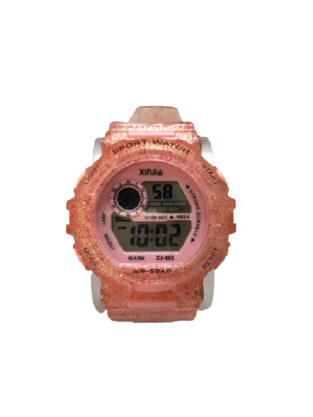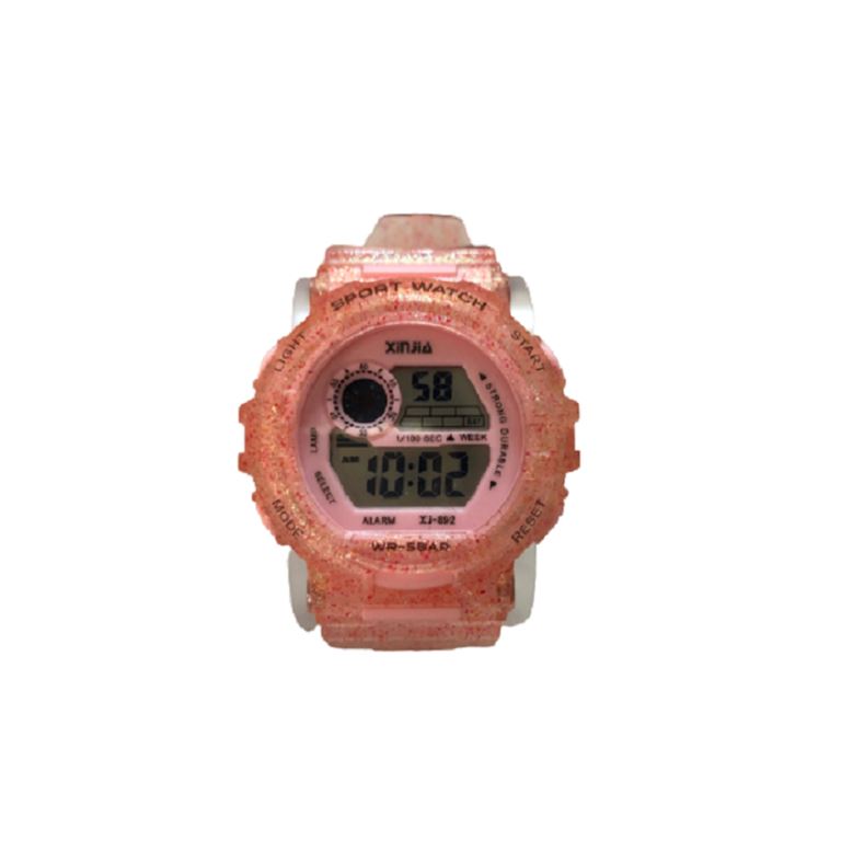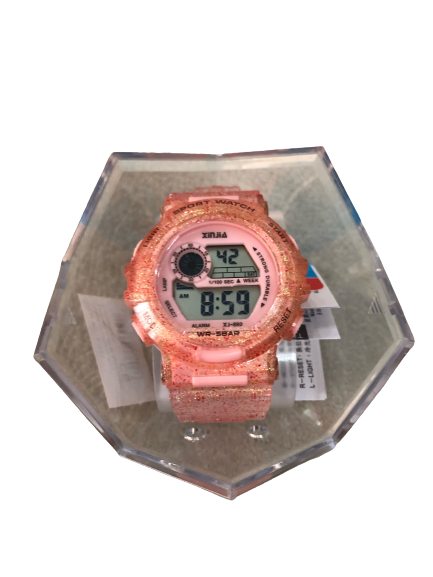 Παιδικό ψηφιακό ρολόι χειρός σε ροζ χρώμα με χρυσόσκονη πολύ καλής ποιότητος με ανθεκτικό λουράκι φτιαγμένο από πλαστικό.