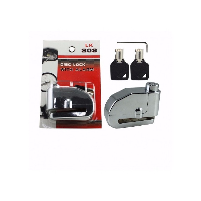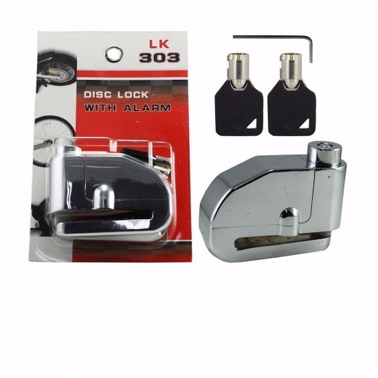 Λουκέτο δισκόφρενου αντικραδασμικό με ενσωματωμένο συναγερμό, ισχύς 110db σειρήνα.Ένα χρήσιμο σύστημα ασφάλειας και προστάσιας της μοτοσικλέτας - σκούτερ- παπί.Ατσάλινος ενισχυμένος κορμός, αμετάβλητος στις καιρικές συνθήκες.Το λουκέτο μπορεί να χρησιμοποηθεί και ως απλό λουκέτο ασφαλέιας.Όταν το ανοίγουμε και αντιστρέψουμε το πέταλο άμεσως ενεργοποιείται ο συναγερμός, ακούγοντας το χαρακτηριστικο ήχο και οπλίζει σε 10sec.Ο συναγερμός όταν ενεργοποιηθεί η σειρήνα χτυπάει για 10sec. Όταν θέλουμε να αφοπλίσουμε βάζουμε το κλειδι στην κλειδαριά.Οι μπαταρίες (6 x A76/LR44 1,5V) χρειάζονται αντικατάσταση όταν θα ακούτε έναν παρατεταμένο ήχο.Στην συσκευάσια περιλαμβάνονται 2 κλειδιά και οι μπαταρίες.