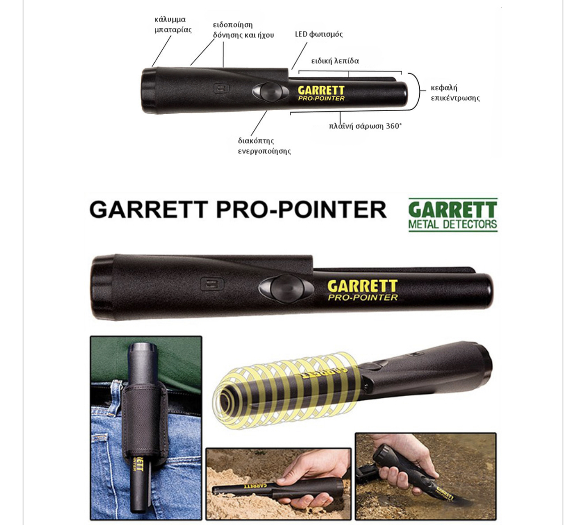 Ο ανιχνευτής μετάλλων GARRETT PRO POINTER ανιχνεύει όλα τα είδη μεταλλικών αντικειμένων έχει εργονομικό σχεδιασμό, ρυθμιζόμενη ευαισθησία, ηχητική ένδειξη ανίχνευσης και Δόνηση Ανίχνευσης.
