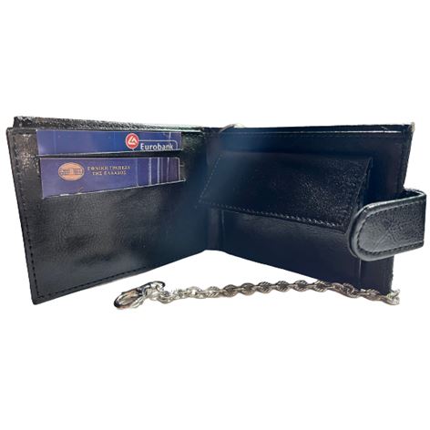 Κλασικό ανδρικό πορτοφόλι με κούμπωμα, υλικό PU (Τεχνόδερμα),με ατσάλινη αλυσίδα και κρίκο, διαστάσεις μήκος (cm) 13 ύψος 10 πλάτος 2,Το πορτοφόλι διαθέτει 1 θήκη ταυτότητας,1 θήκη διπλώματος, 1 θήκη για κέρματα με κουμπί,3 θήκες για κάρτες, 2 θήκες για χαρτονομίσματα ,πολύ καλή επιλογή για δώρο στα αγαπημένα σας πρόσωπα.