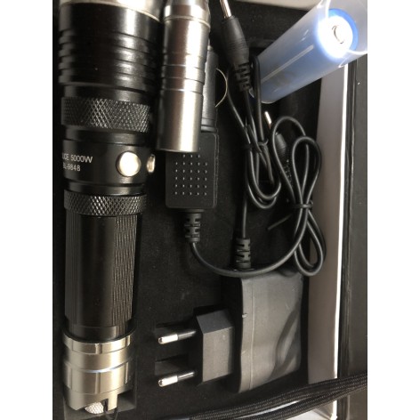 Επαναφορτιζόμενος φακός με laser και zoom στα 5000 lumens ιδιαίτερο χαρακτηριστικό του είναι η υψηλή φωτεινότητα και η ακτίνα του φτάνει τα 400m.Είναι κατασκευασμένος από υψηλής ποιότητας υλικά,στιβαρή κατασκευή και είναι χρήσιμος για σώματα ασφαλείας, κυνήγι-ψάρεμα, πεζοπορίες,σπηλαιολογία.Έρχεται σε συσκευασία με καλώδιο φόρτισης usb αντάπτορα ρεύματος,φορτιστή αυτοκινήτου και eco pack για παράλληλη λειτουργία με αλκαλικές μπαταρίες.
