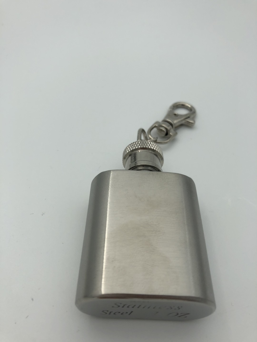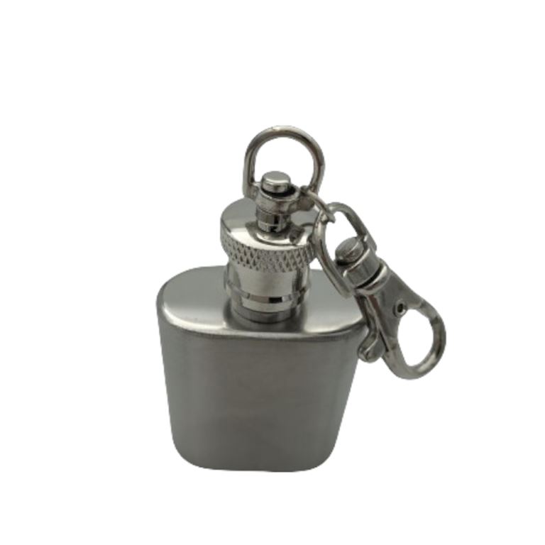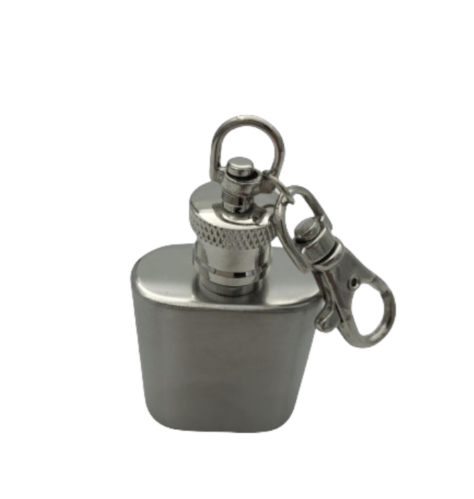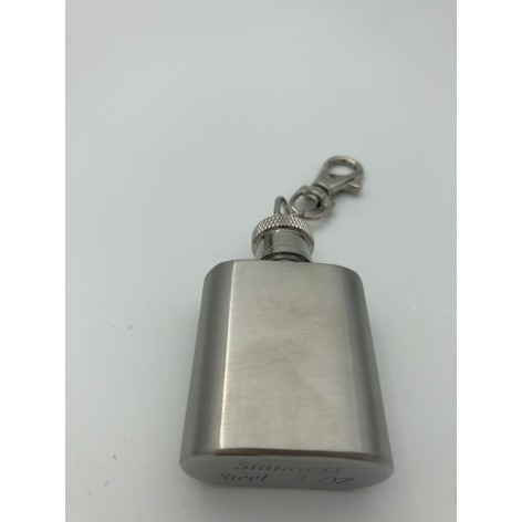 Mini φλασκί πολυτελείας από καθαρό ανοξείδωτο ατσάλι πλακέ σχέδιο κούμπωμα ασφαλέιας, έχει κρίκο μπορεί να φορεθεί ως μπρελόκ και περνάει απαρατήρητο.Χωρητικότητα 28,5gr.