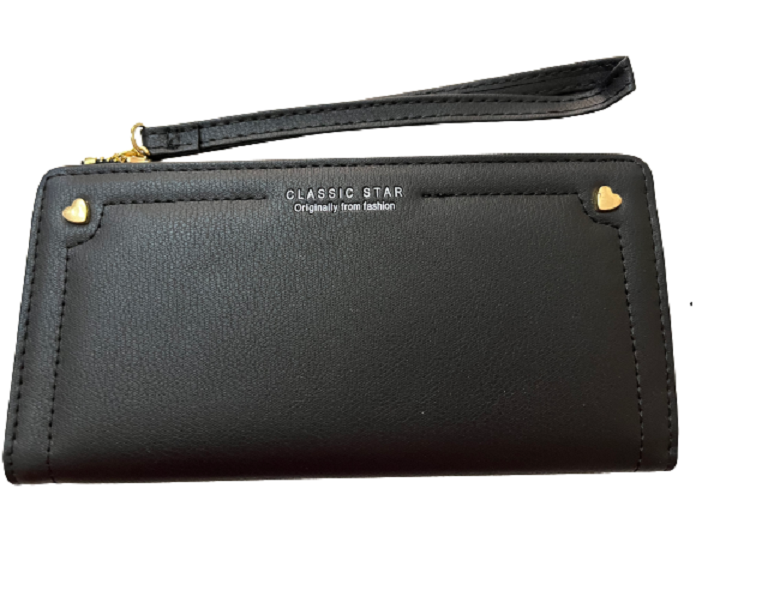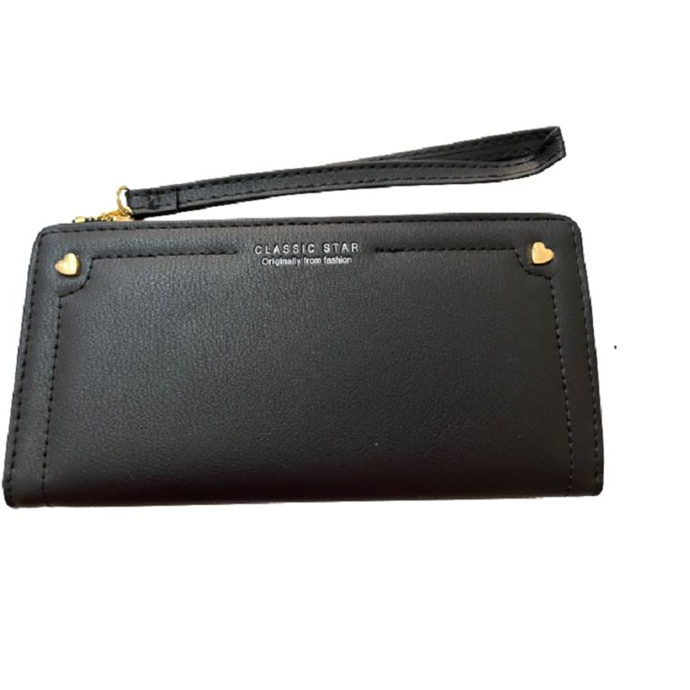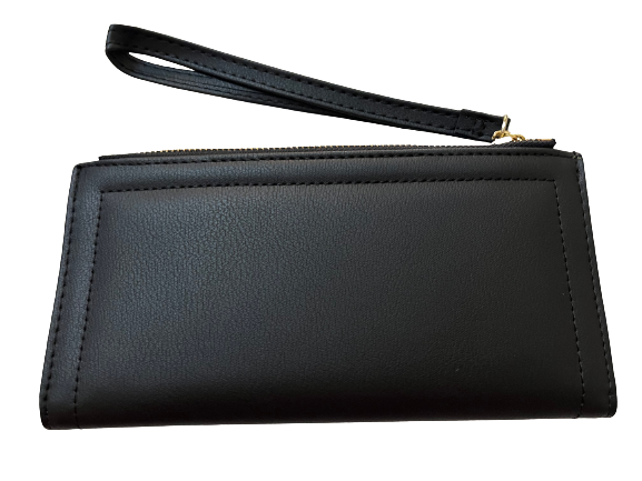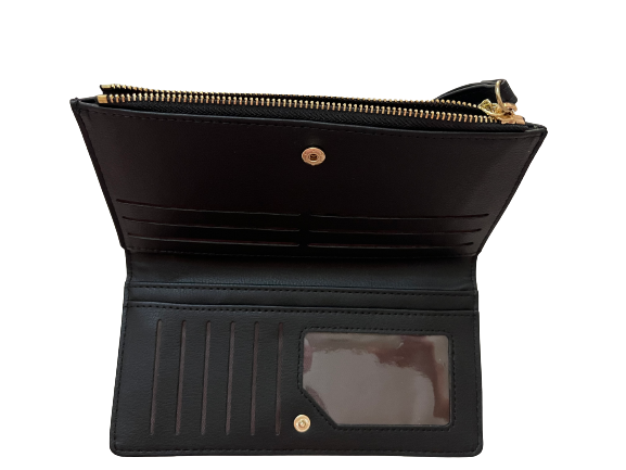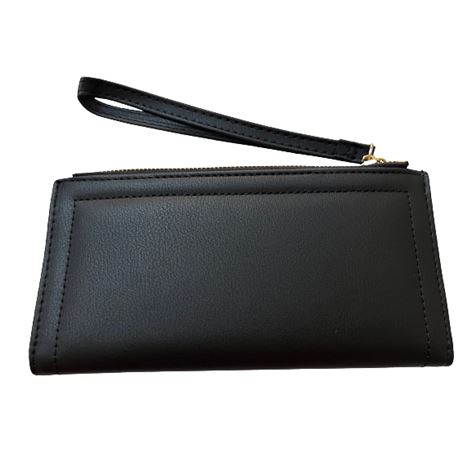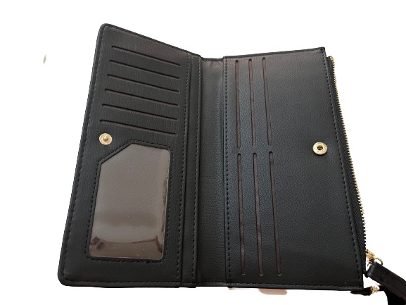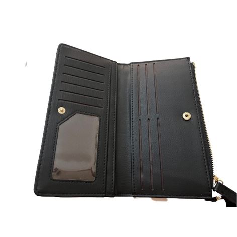 Γυναικείο πορτοφόλι μαύρου χρώματος με πολλούς χώρους και λουράκι χειρός το οποίο διαθέτει 3 θήκες εσωτερικά, 1 θήκη με φερμουάρ και 13 θήκες για κάρτες.