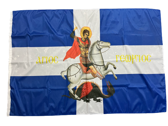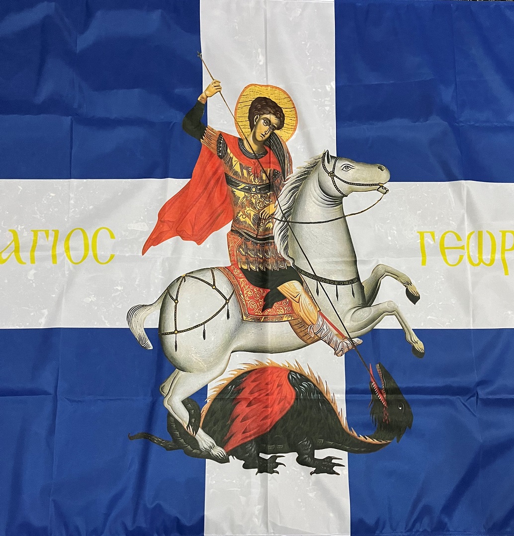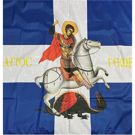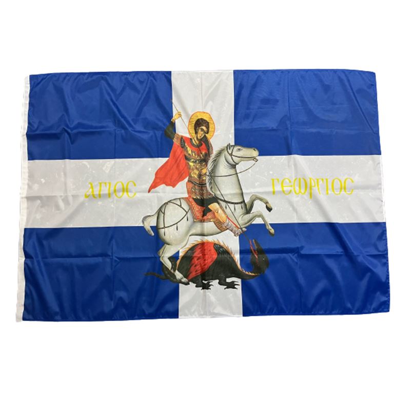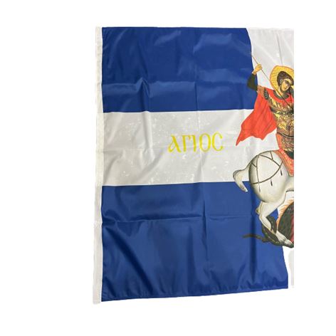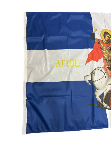 Ιστορική Ελληνική σημαία με τον Άγιο Γεώργιο,με χρυσά γράμματα, αρίστης ποιότητος με σημαιόπανο τριπλής πλέξης 120gr , διπλές ραφές με υψηλής αντοχής κλωστές, οικολογικά ανεξίτηλα χρώματα με ισχυρούς πλαστικούς κρίκους και με τελείωμα σε ειδικό φούρνο ατμίσματος ώστε να είναι αμετάβλητη στο χρόνο. Αντιανεμικό πολυεστερικό υλικό με αντοχή 120km φορτίο ανέμου.