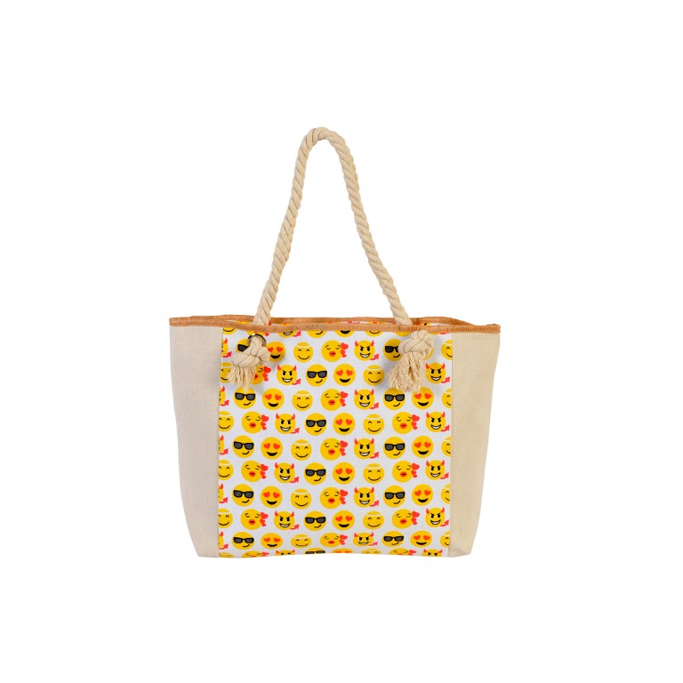Γυναικεία τσάντα θαλάσσης ώμου, με design Emoji με την οποία μπορείτε μεταφέρετε τις πετσέτες σας και τα προσωπικά σας αντικείμενα, εξαιρετικής ποιότητας και κατασκευής από αδιάβροχο ύφασμα, φοδραρισμένη επένδυση και εσωτερική θήκη με φερμουάρ και στο πάνω μέρος ασφαλίζει με φερμουάρ.Διαστάσεις M x Y x Π (cm) 45 x 31 x 12