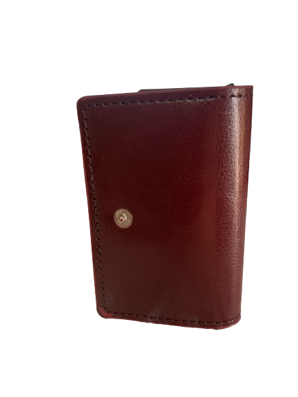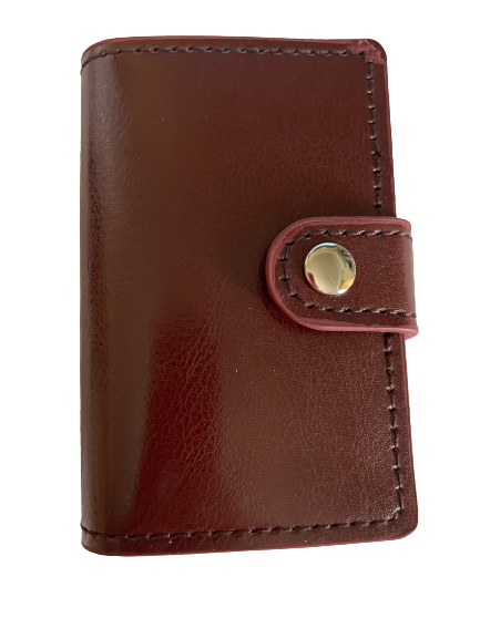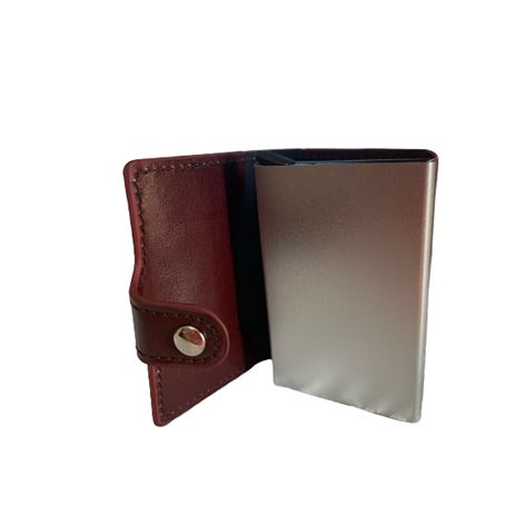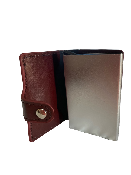 Δερμάτινη Θήκη με κούμπωμα καφέ χρώματος με εσωτερική θήκη αλουμινίου πιστωτικών καρτών χρώματος ασημί με λειτουργία μπλοκαρίσματος RFID για αποφυγή κλοπής δεδομένων σας, για να βγάλετε τις κάρτες πιέστε το κουμπί.
