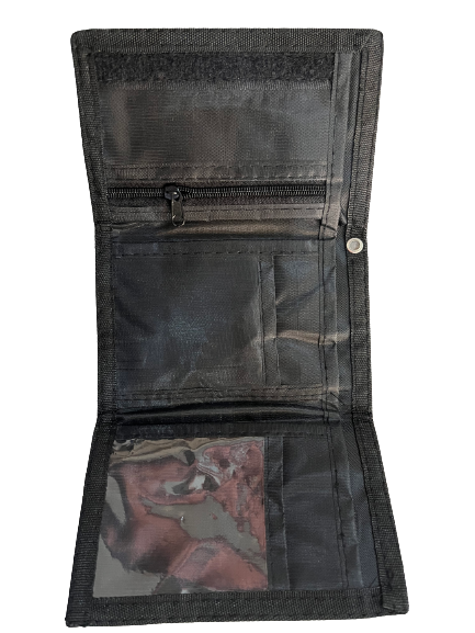 Πορτοφόλι με ραφτό logo,1 εσωτερική θήκη για χαρτονομίσματα, 4 εσωτερικές θήκες για δίπλωμα κάρτες κλπ,1 εσωτερική διάφανη θήκη για φωτογραφία και 1 θήκη για κέρματα.