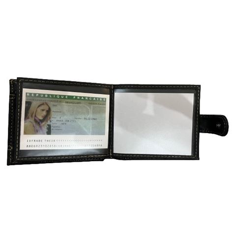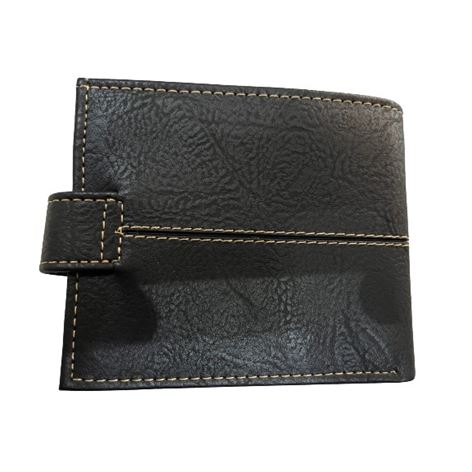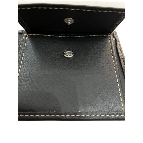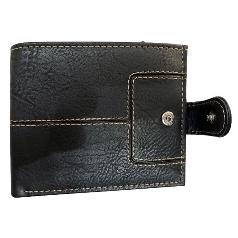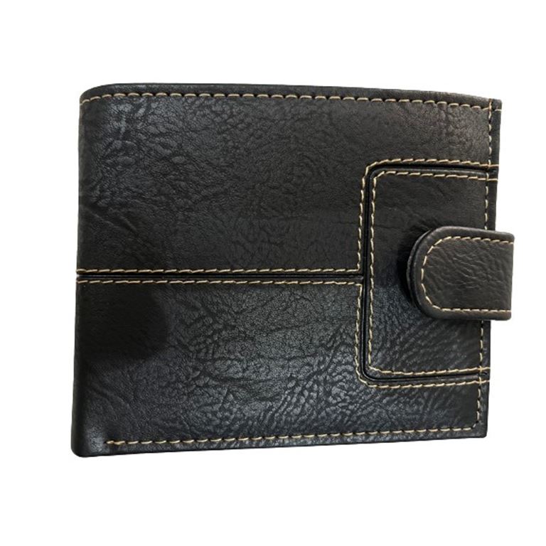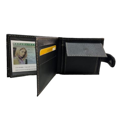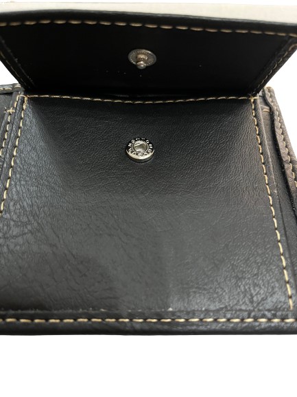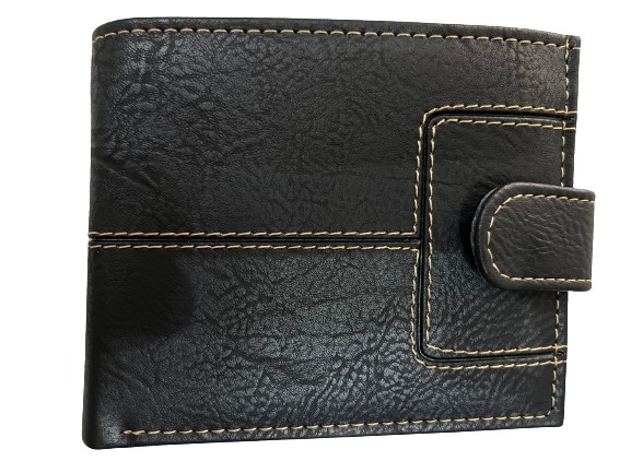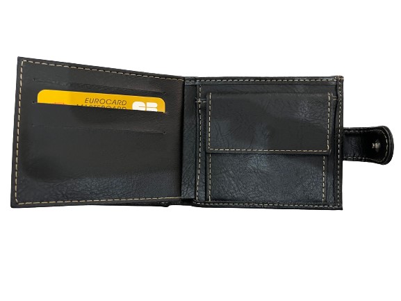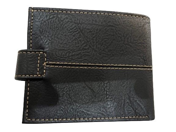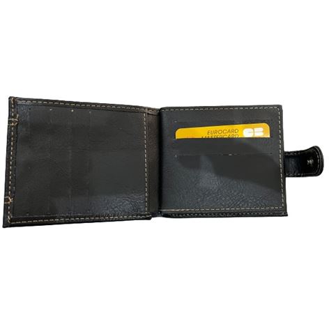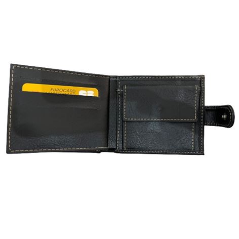 Πορτοφόλι ανδρικό μαύρο χρώμα περιμετρικά με εκρού γαζί από PU τεχνόδερμα και φοδραρισμένο με γαζιά. Το πορτοφόλι διαθέτει 2 θήκες για χαρτονομίσματα εκ των οποίον η 1 με φερμουάρ,1 θήκη για ταυτότητα,1 για φωτογραφία ή δίπλωμα αυτοκινήτου, 11 θήκες για πιστωτικές κάρτες, 2 κρυφές θήκες στο πλάι αριστερά-δεξιά,1 θήκη με κούμπωμα για κέρματα.