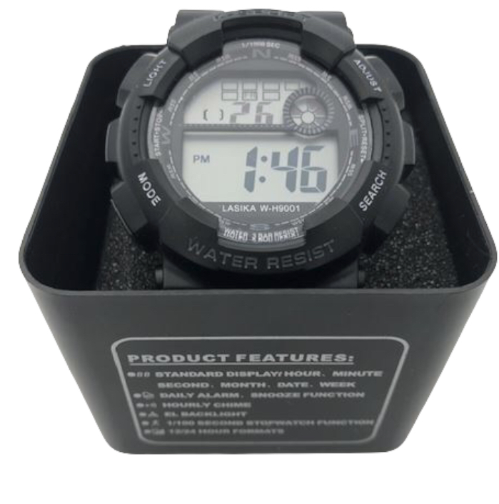 Παιδικό ψηφιακό ρολόι χειρός σε μαύρο χρώμα πολύ καλής ποιότητος με ανθεκτικό λουράκι φτιαγμένο από πλαστικό.